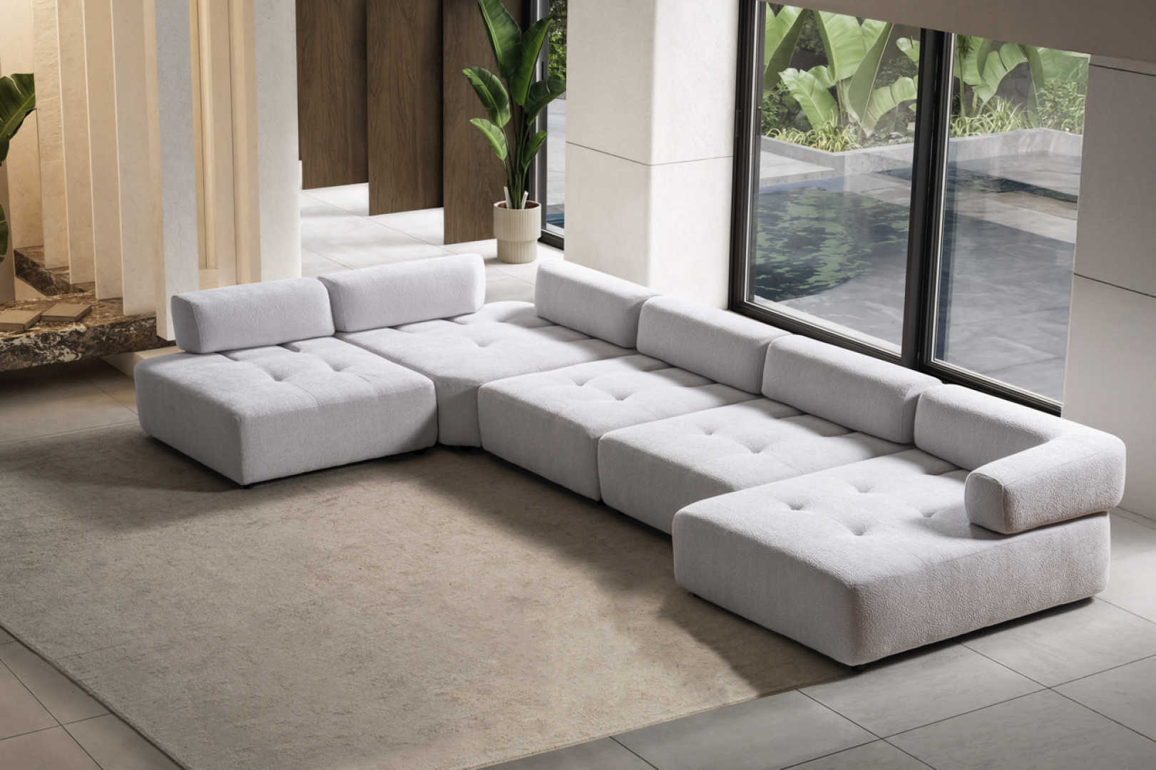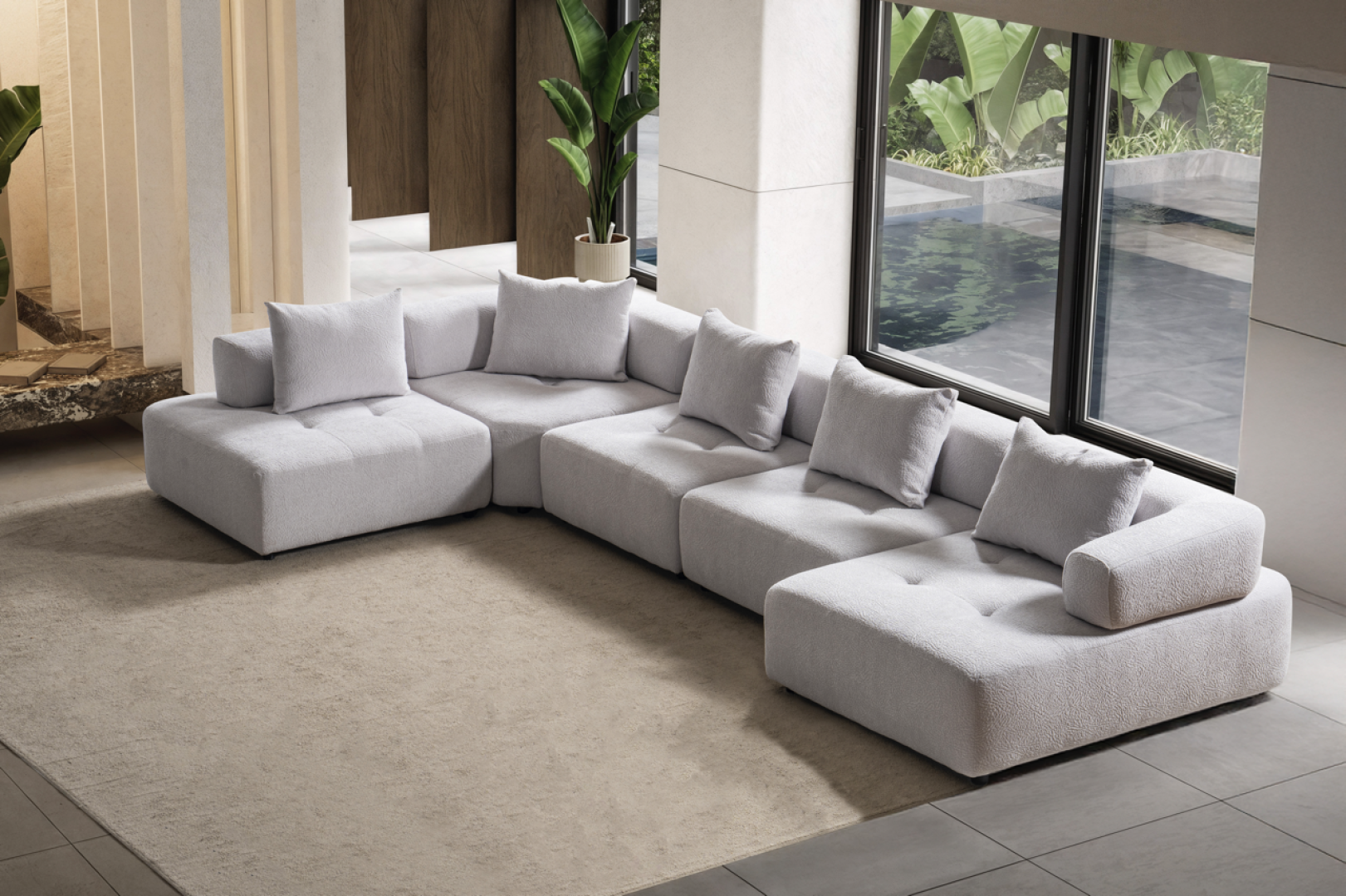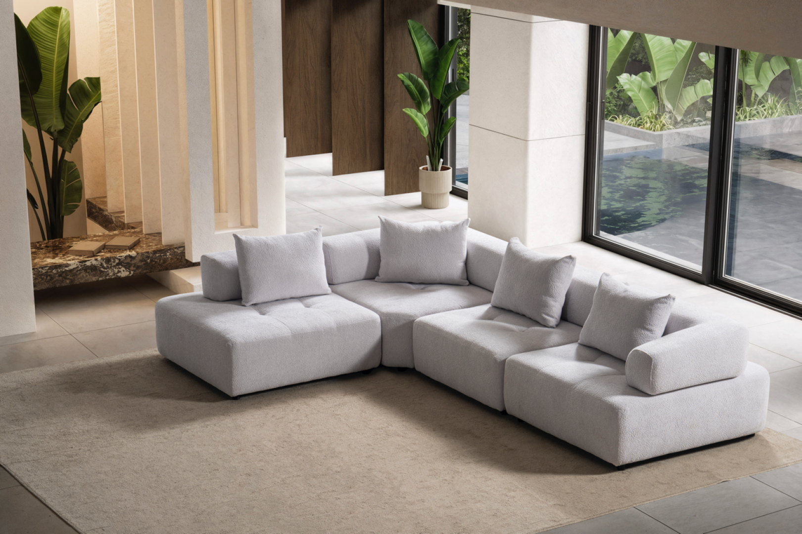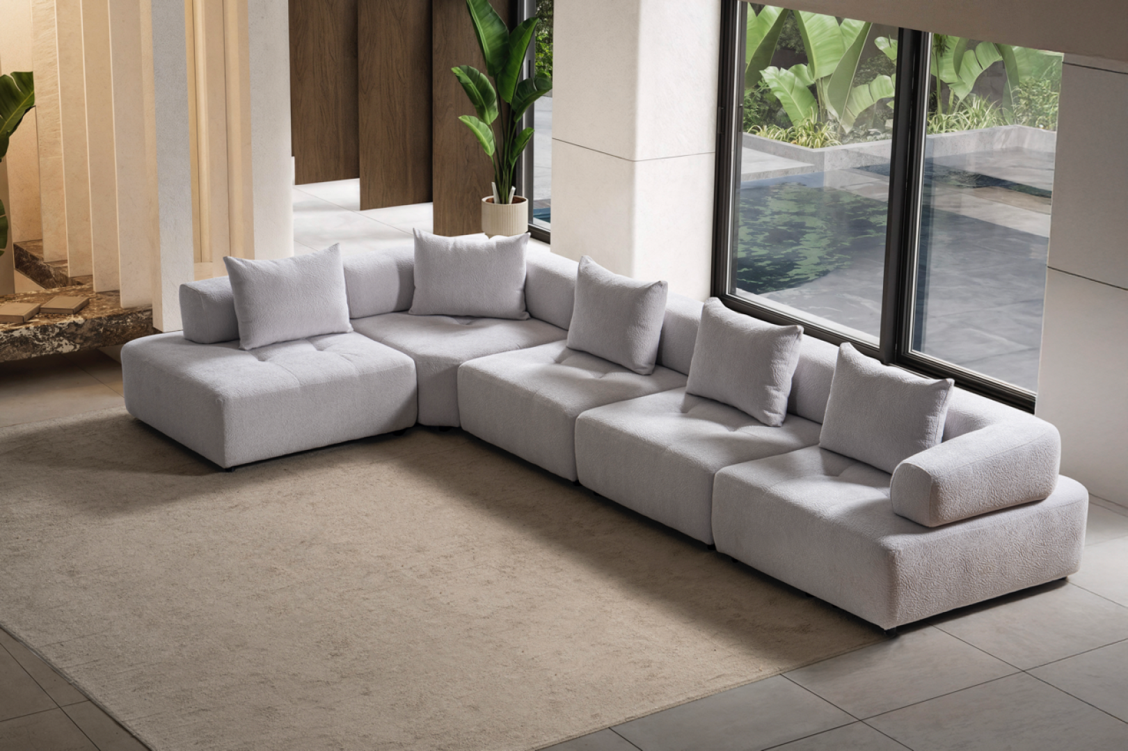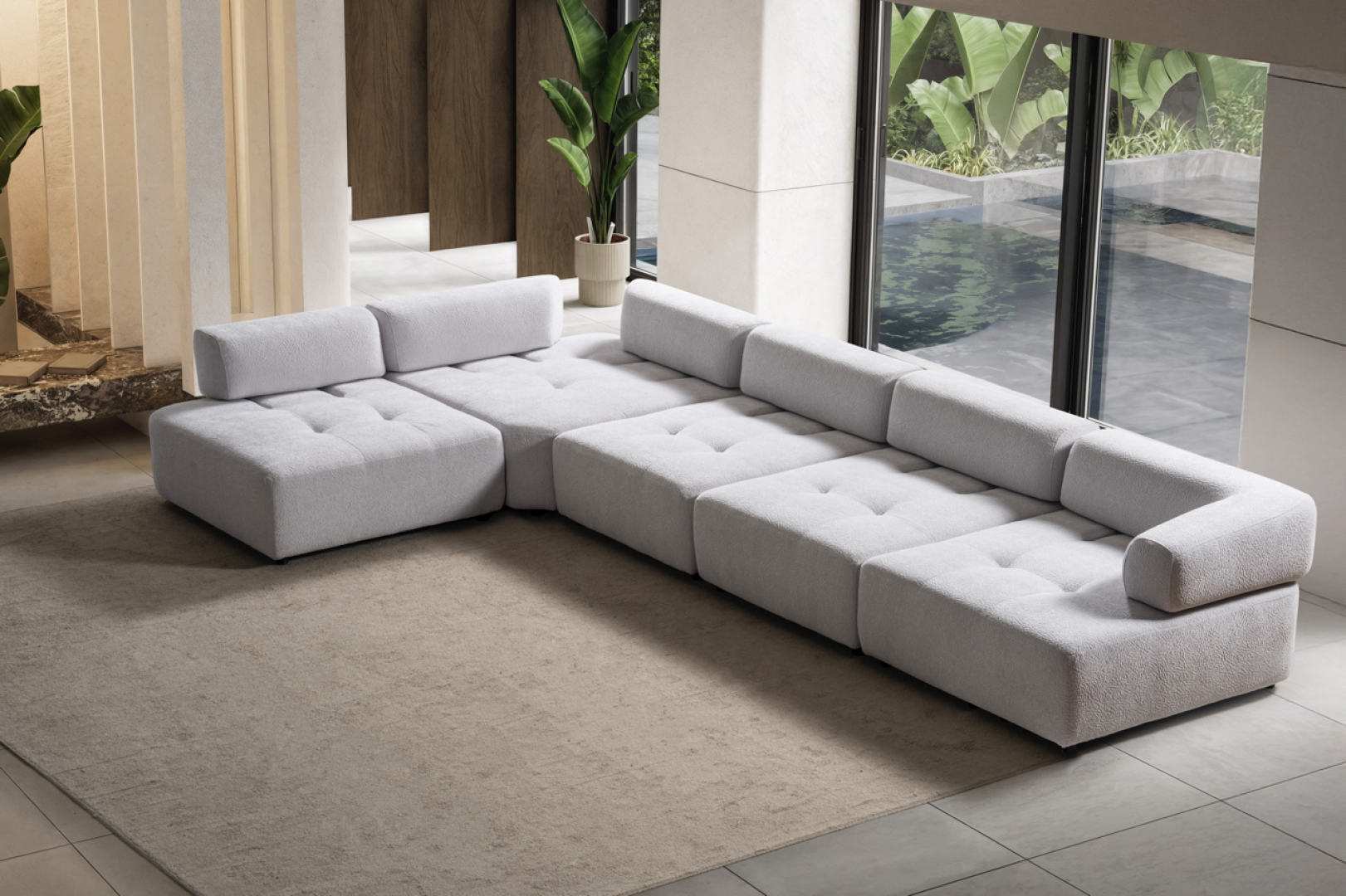 Oturum alanı, geniş ve kesintisiz yüzeyler üzerinden ilerler. Sırt yapısı mekânın genel oranlarını bozmadan konfor sağlar. Köşe geçişi, sert kırılmalar yerine yumuşak bir devamlılık hissi yaratacak şekilde tasarlanmıştır. Genel form, modern mekânlarda aranan düzenli ve akışkan görünümü destekler.