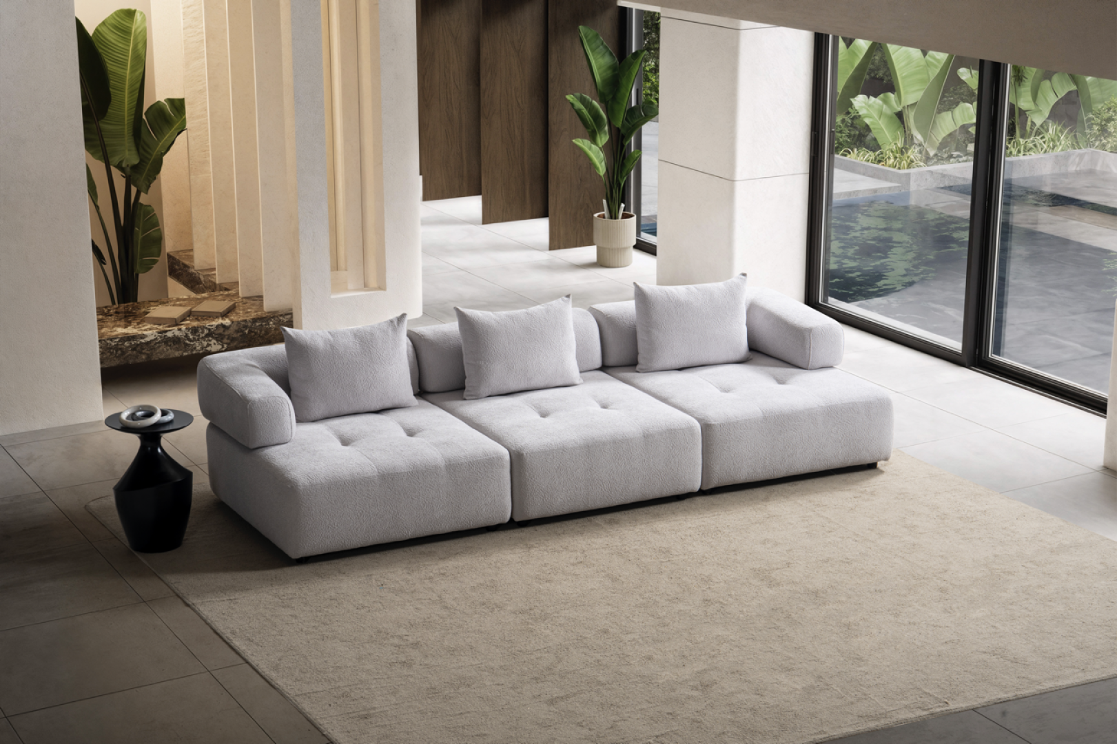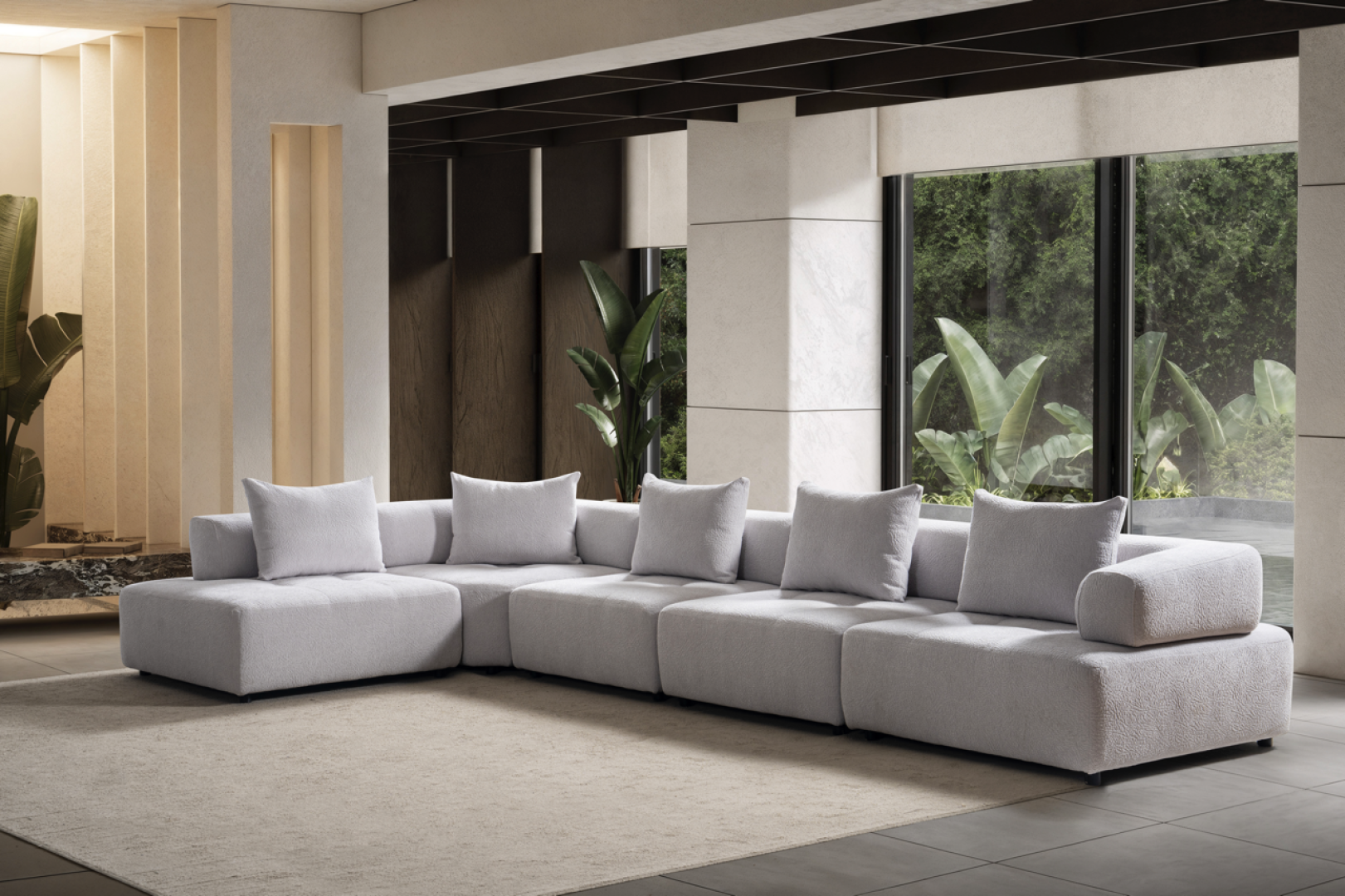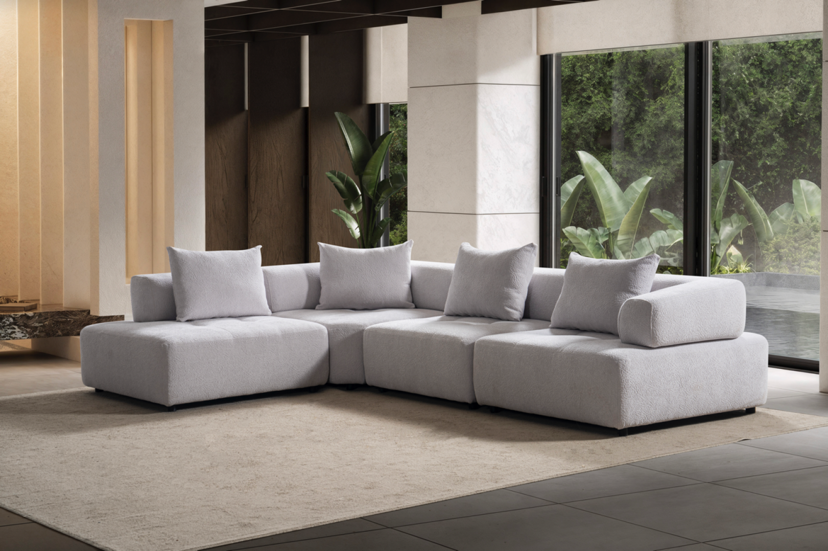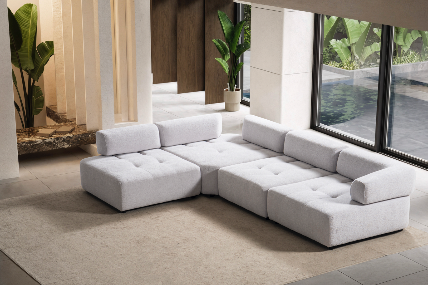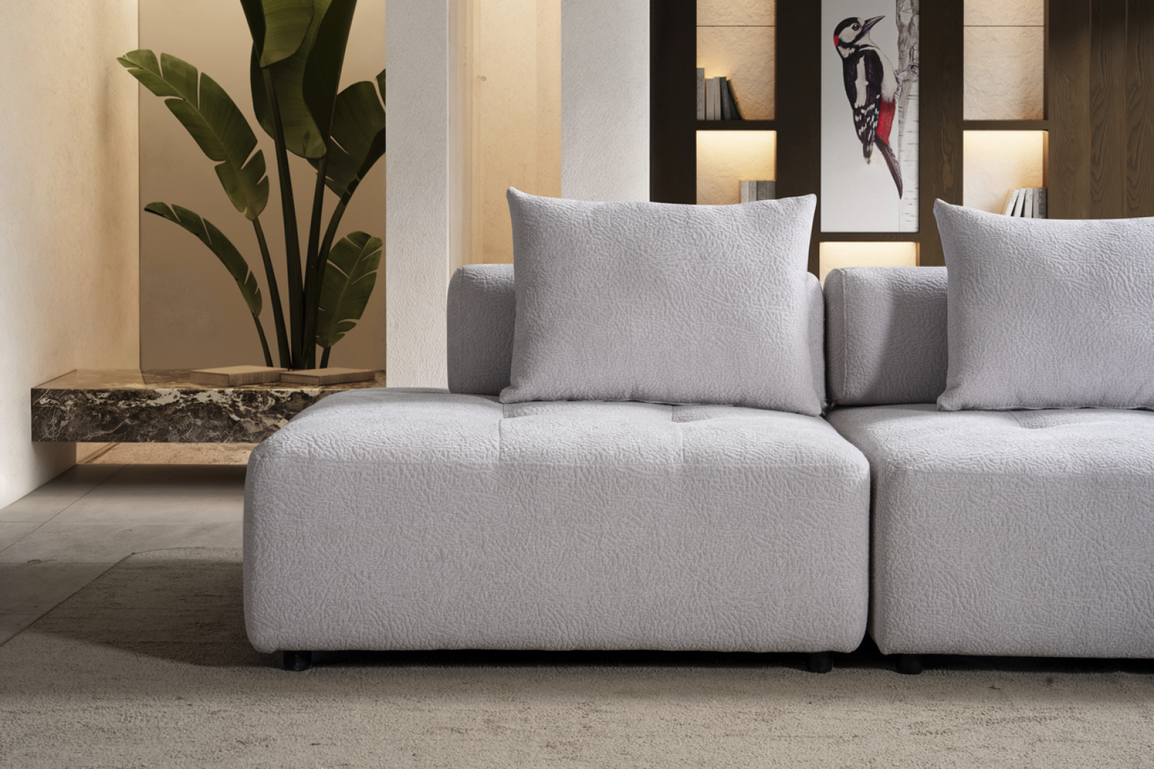 Oturum alanı, geniş ve kesintisiz yüzeyler üzerinden ilerler. Sırt yapısı mekânın genel oranlarını bozmadan konfor sağlar. Köşe geçişi, sert kırılmalar yerine yumuşak bir devamlılık hissi yaratacak şekilde tasarlanmıştır. Genel form, modern mekânlarda aranan düzenli ve akışkan görünümü destekler.