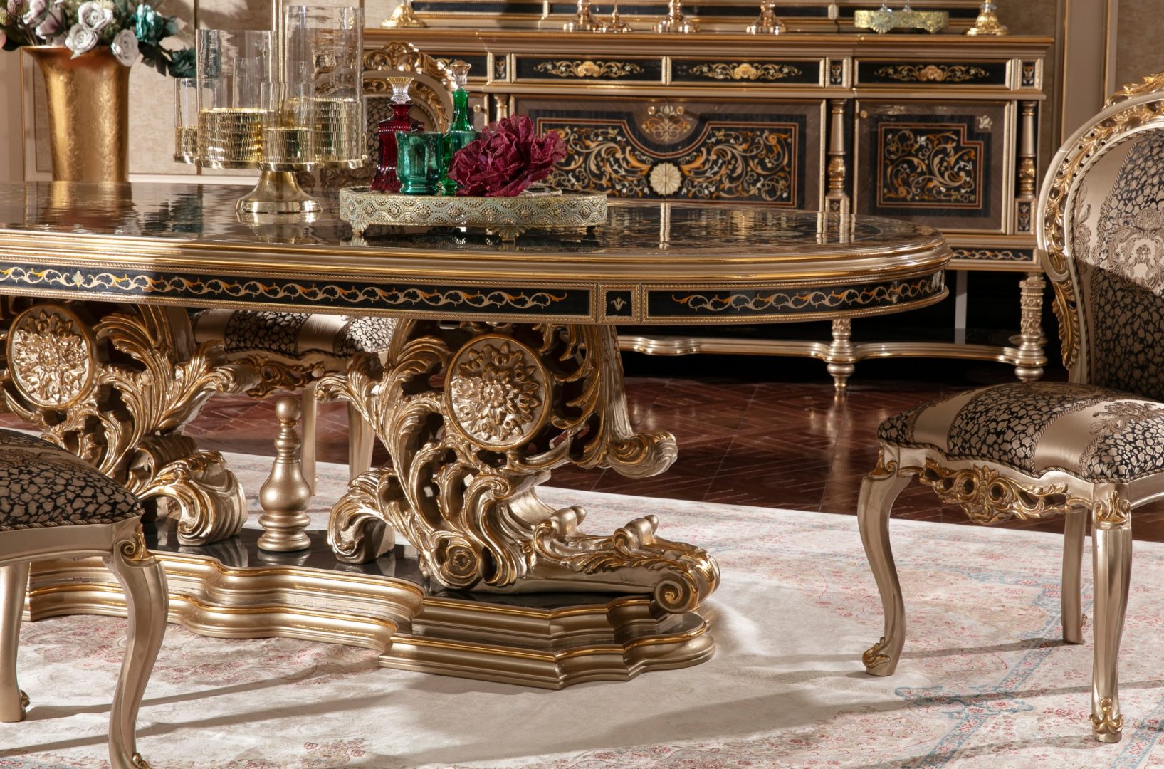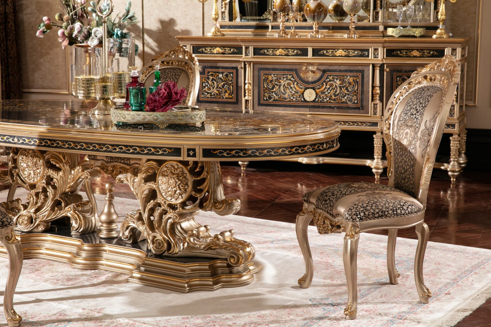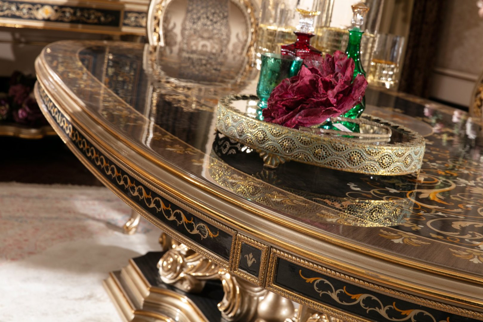 Kompozisyon, klasik dining room heritage anlayışına dayanır. Simetri duygusu, kontrollü detay kullanımı ve form bütünlüğü, ürünün güçlü ama ölçülü bir karakter kazanmasını sağlar. Yüzeyler arasındaki geçişler bilinçli şekilde kurgulanmış, detaylar genel yapıyı destekleyen mimari bir dil olarak ele alınmıştır. Bu yaklaşım, Belucia’yı dönemsel süsleme anlayışından uzaklaştırarak kalıcı bir tasarım değerine taşır.