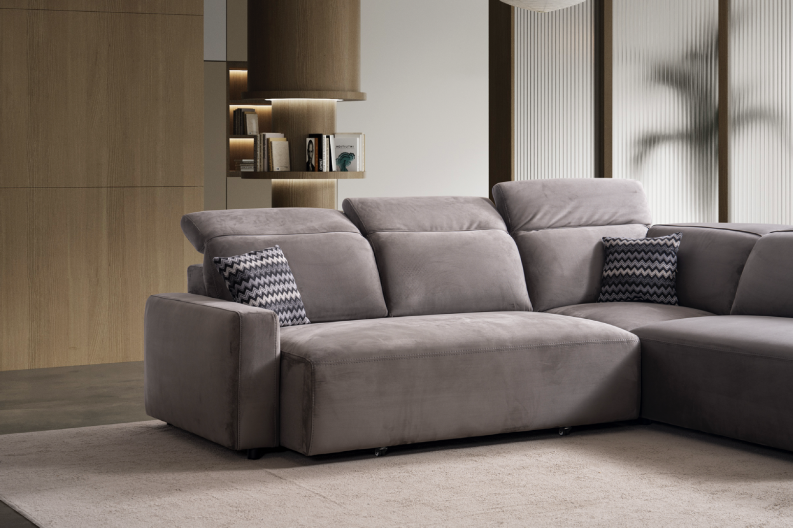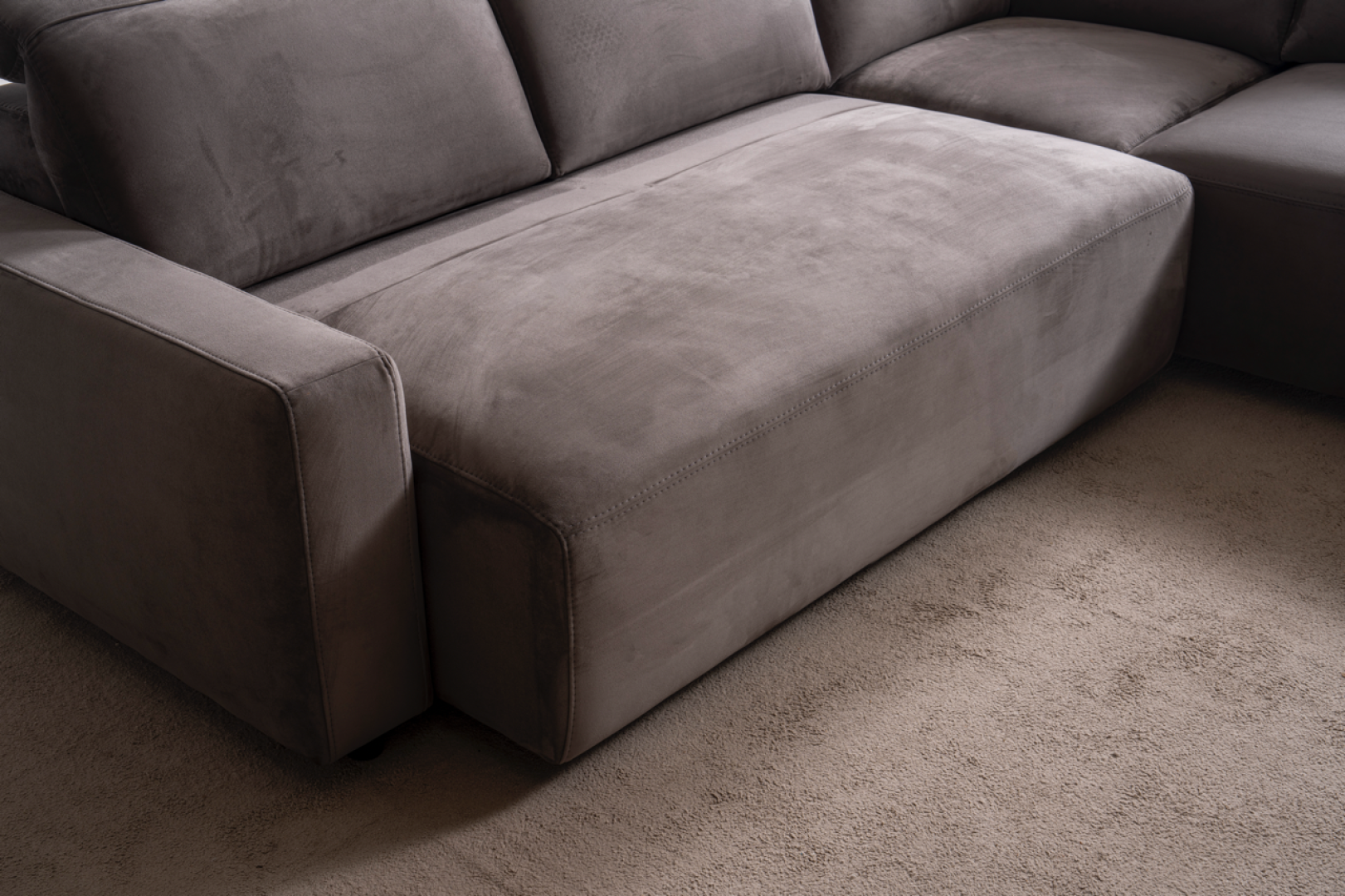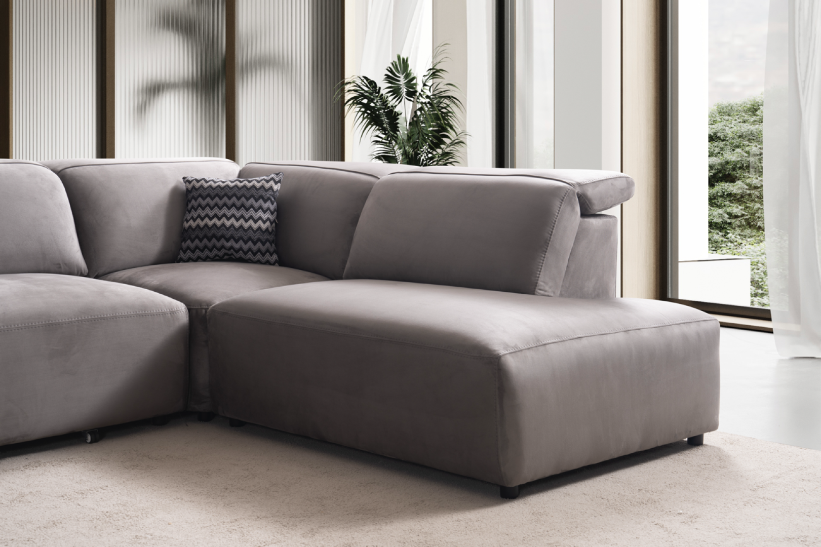 Oturum alanı, geniş yüzeyler ve sağlam oranlarla kurgulanmıştır. Sırt yapısı hacimli gövdeyi dengeleyerek mekânla uyumlu bir bütünlük sağlar. Köşe geçişi, formun gücünü kesintiye uğratmadan devamlılık hissi sunacak şekilde tasarlanmıştır. Genel siluet, modern mekânlarda aranan güçlü ama kontrollü görünümü destekler.