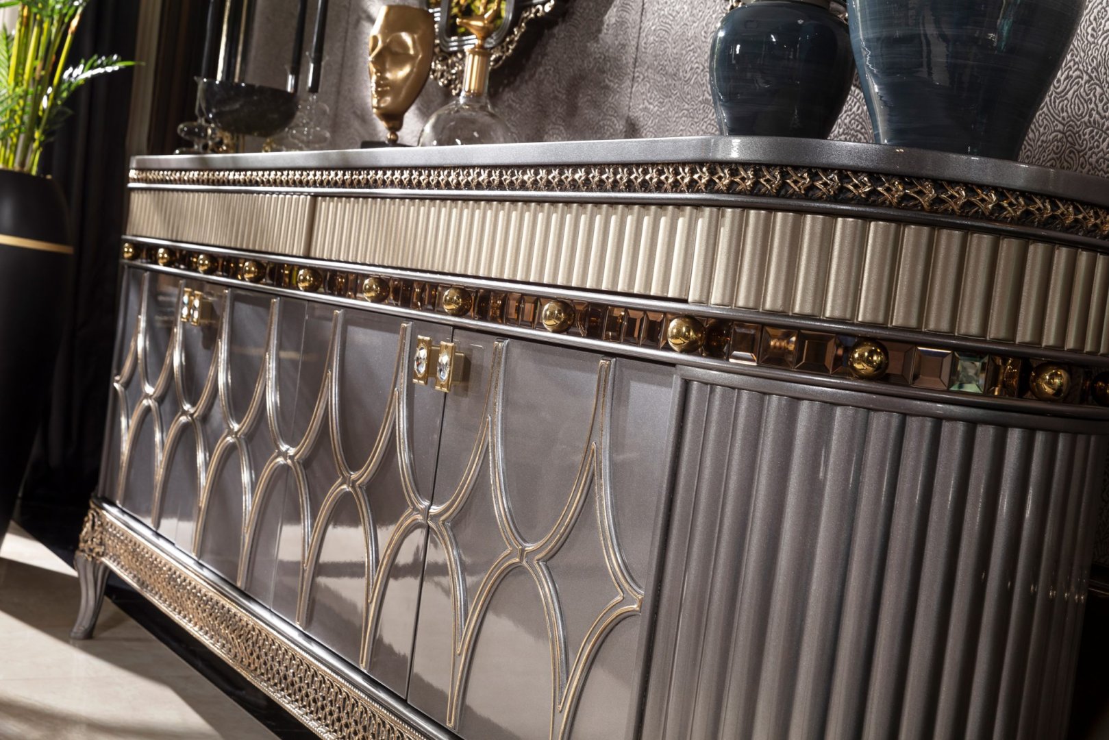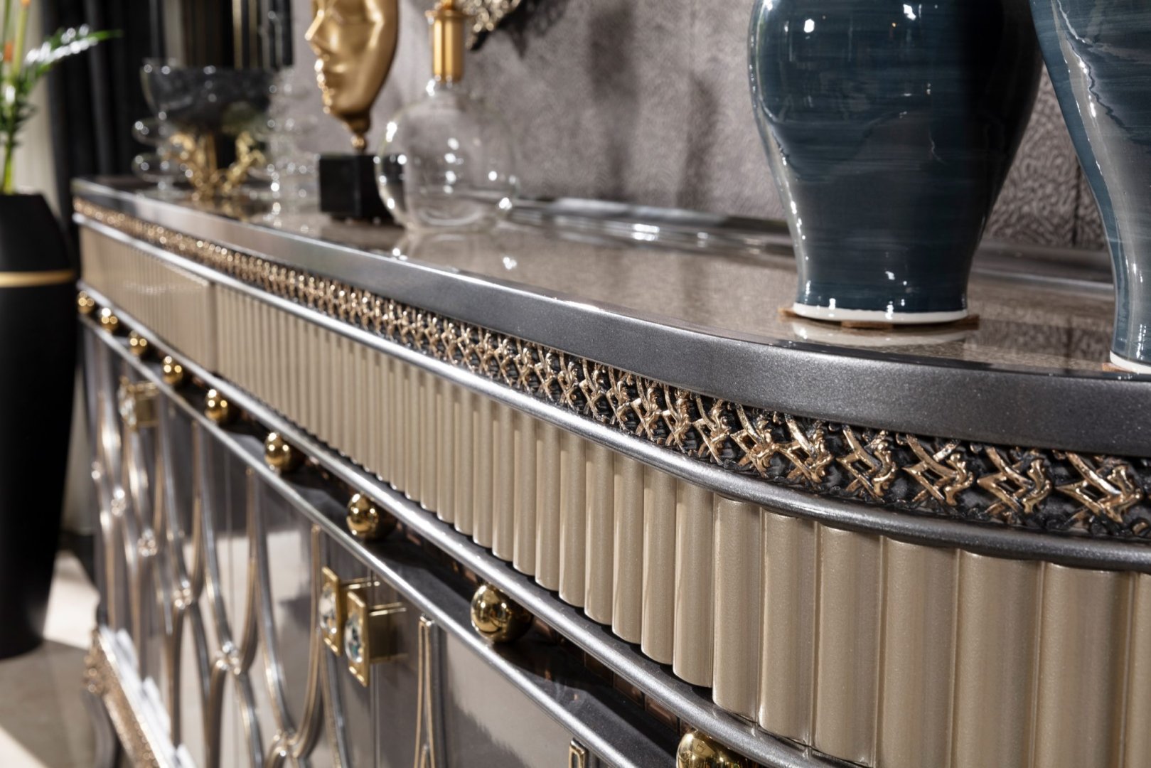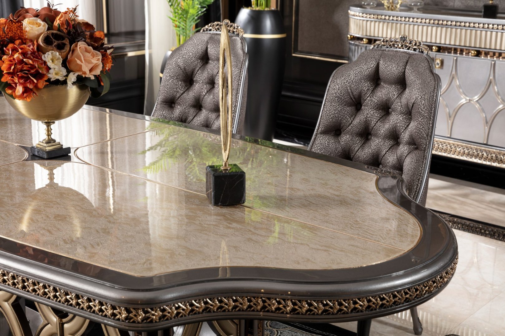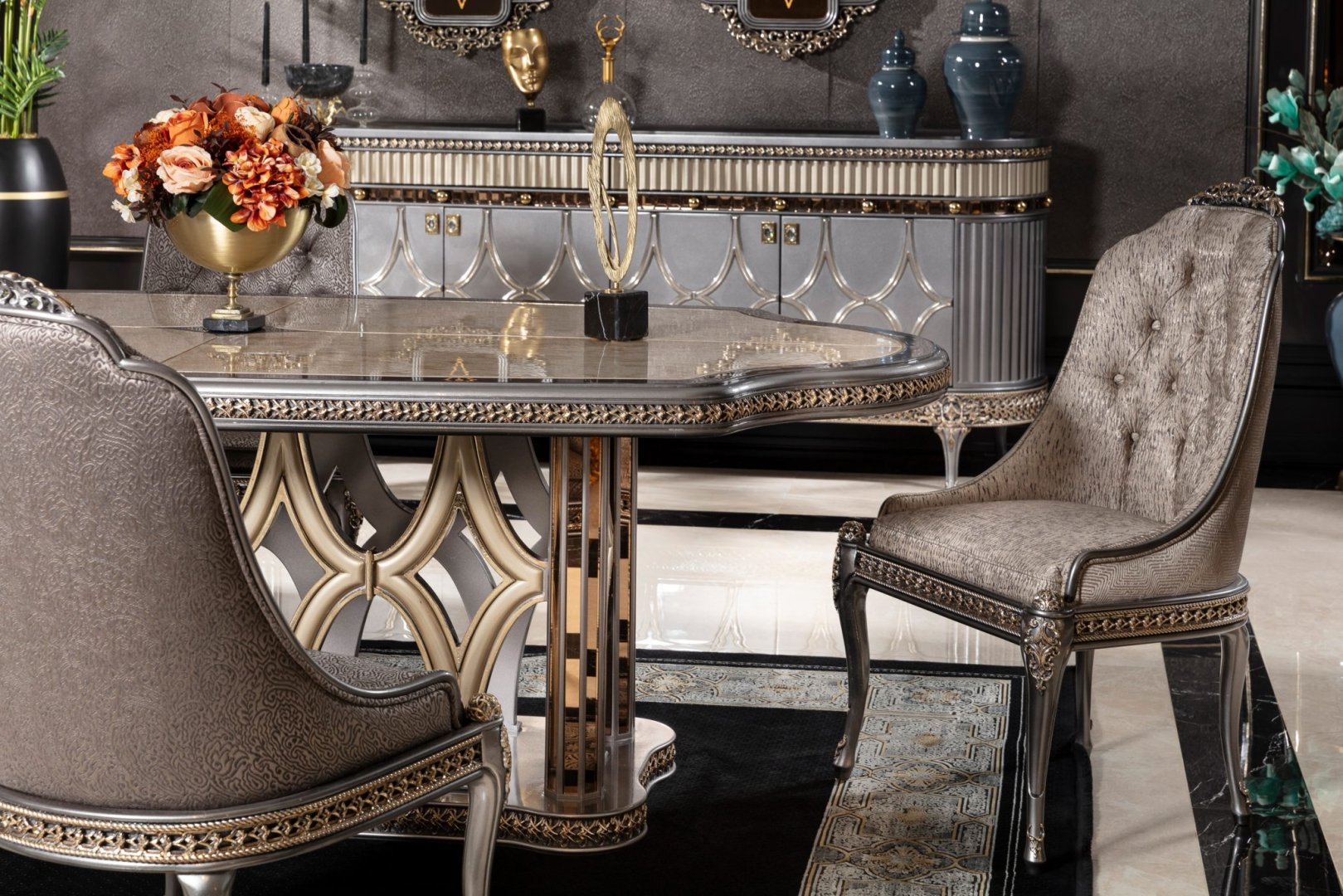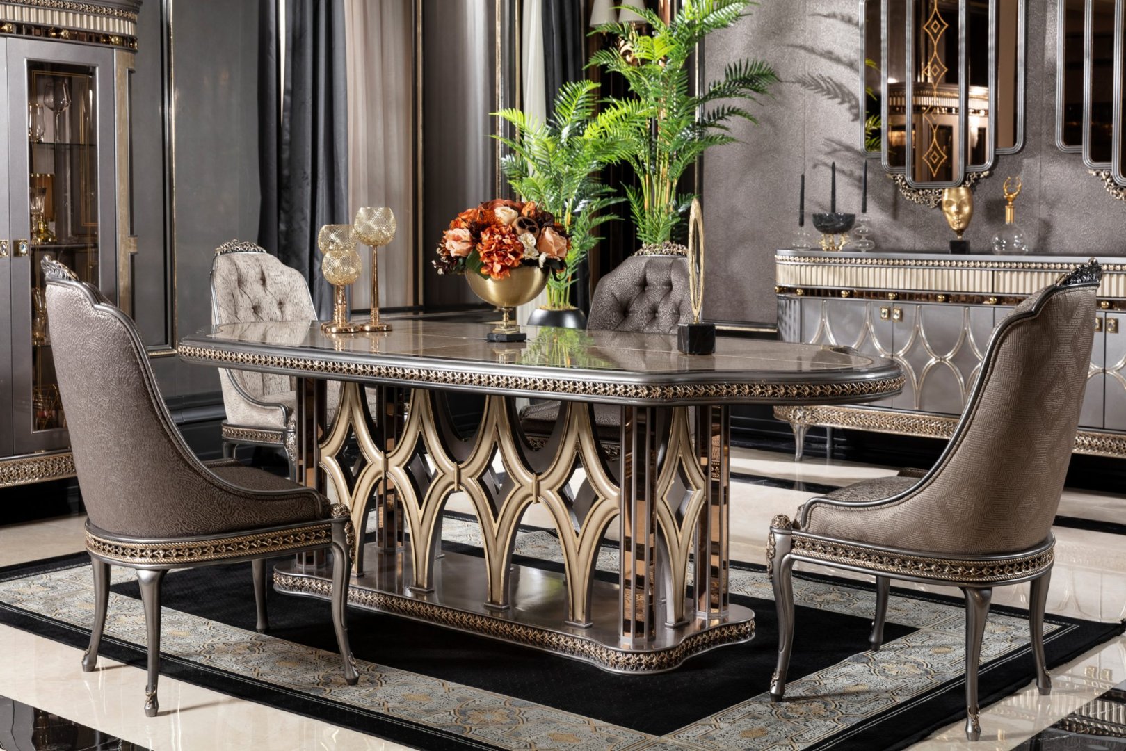 Momentum Luxury Klasik Yemek Odası, klasik tasarım geleneğini güçlü bir temsil dili ve mimari disiplinle yeniden yorumlayan seçkin bir koleksiyondur. Kompozisyon, görsel ihtişamı abartılı süslemelerle değil; oranların netliği, form bütünlüğü ve yüzey derinliği üzerinden kurar. Momentum, yemek alanında köklü, otoriter ve zamana karşı dirençli bir atmosfer oluşturur.