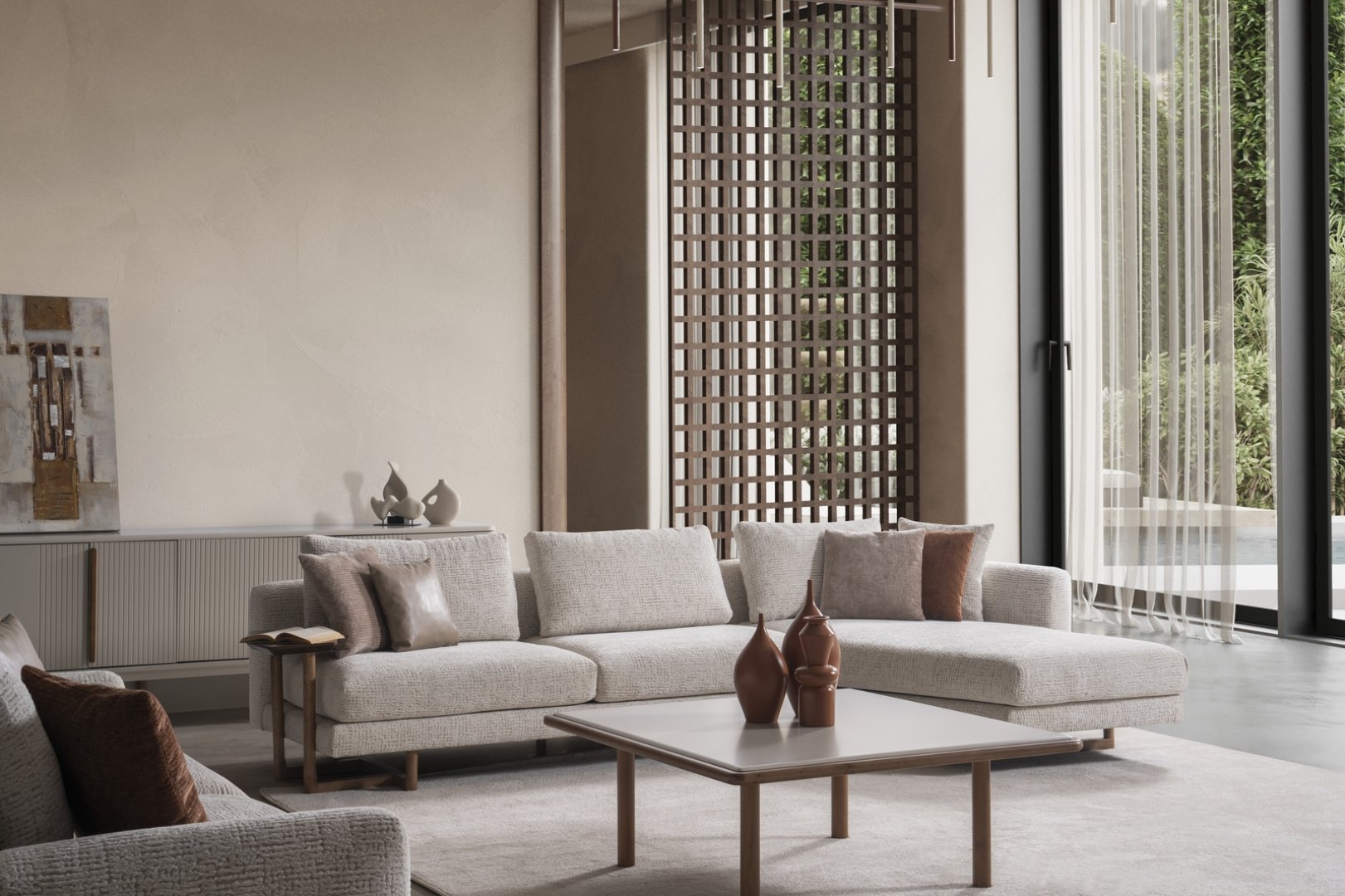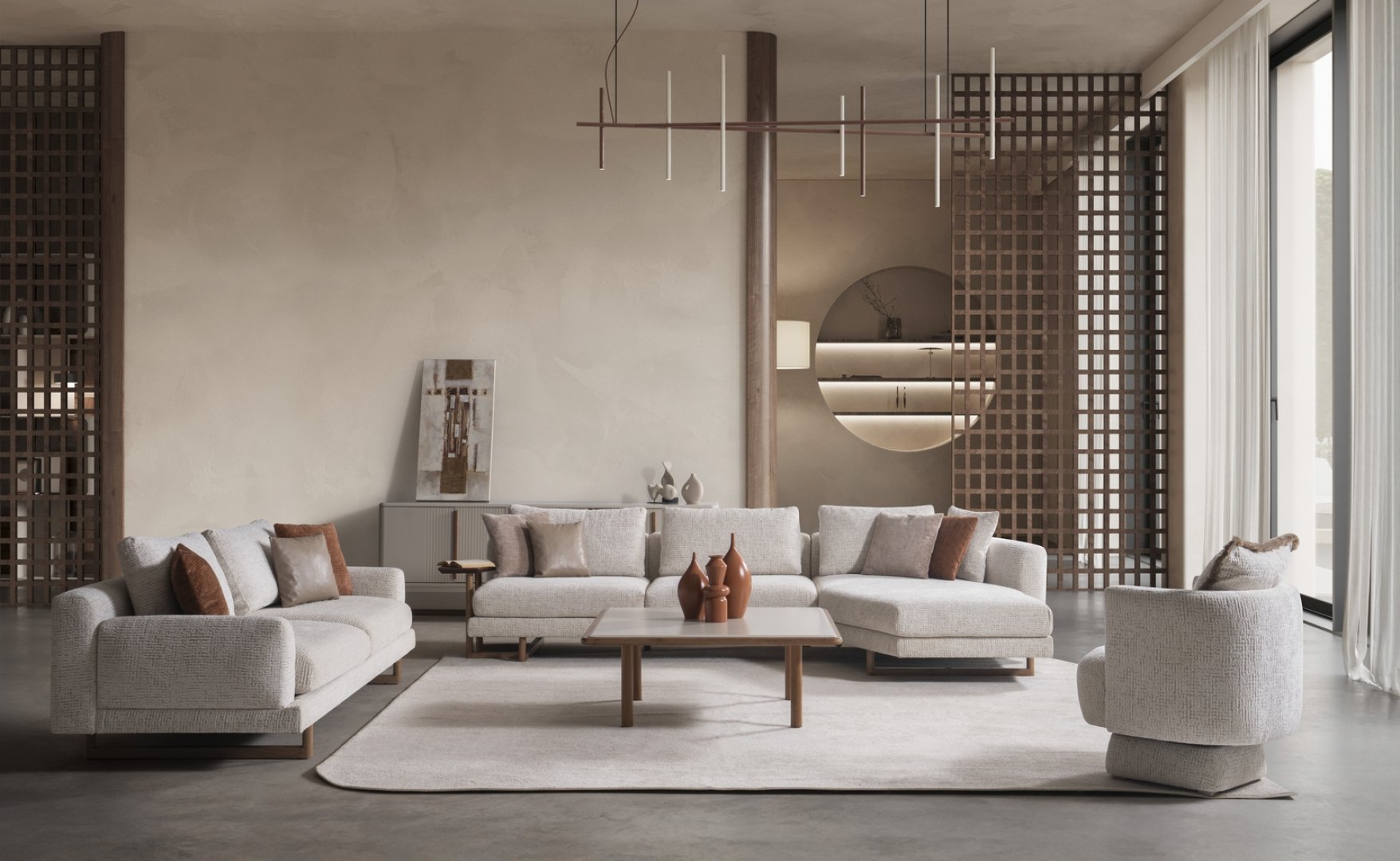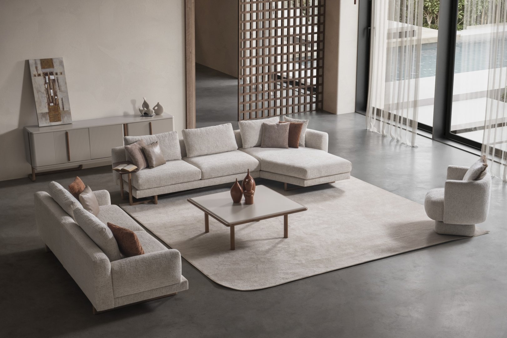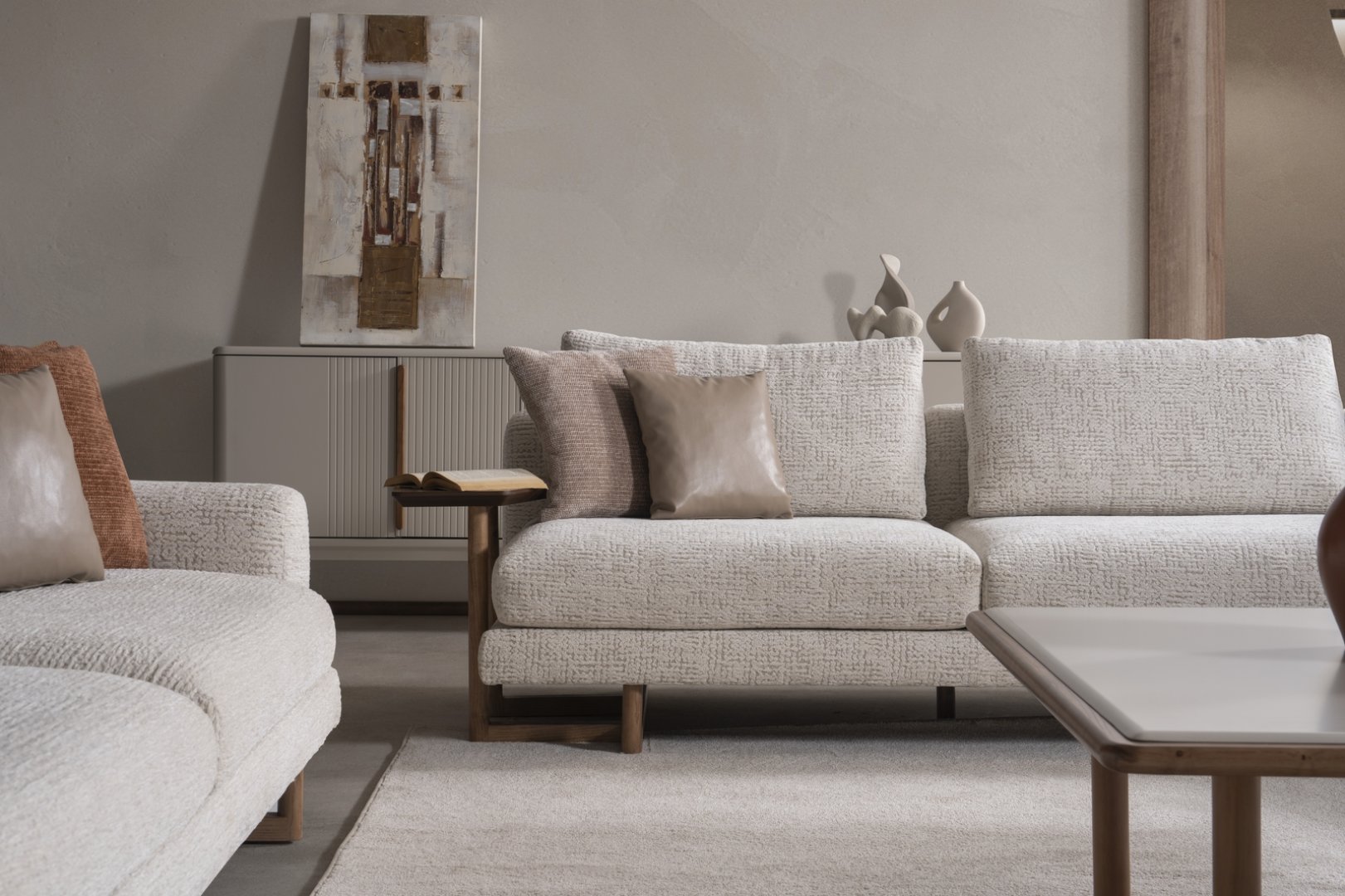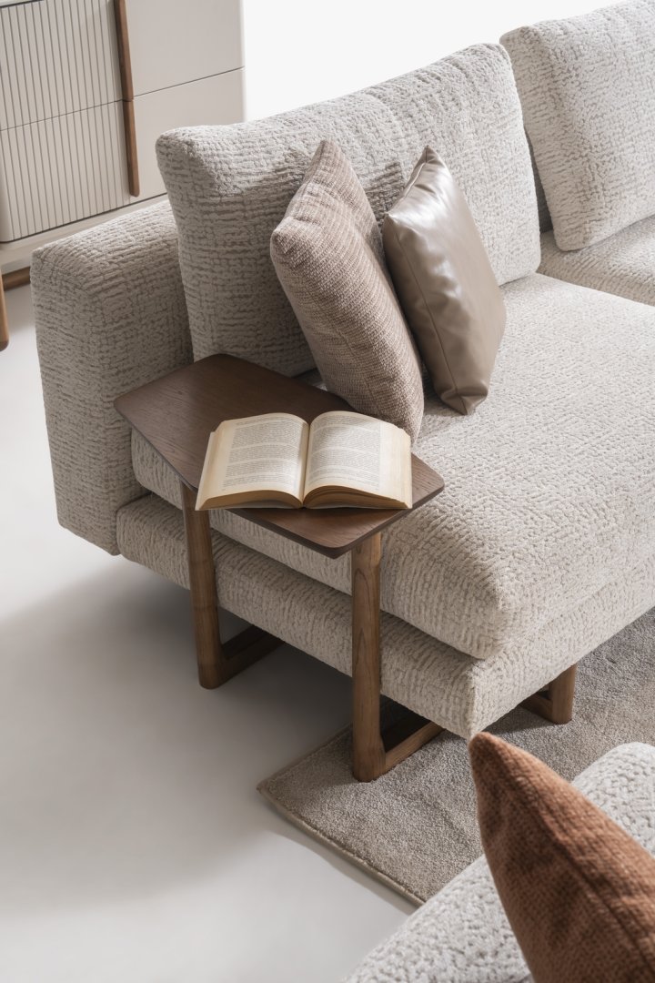 Aksa Koltuk Takımı, modern salon dekorasyonu içinde mekânın merkezini tanımlayan bir rol üstlenir. Açık plan yaşam alanlarında düzenli bir yerleşim sunar, daha kompakt salonlarda ise alanın ferah ve kontrollü algılanmasına katkıda bulunur. Oran odaklı tasarımıyla modern koltuk takımı anlayışına zamansız bir yorum getirir.