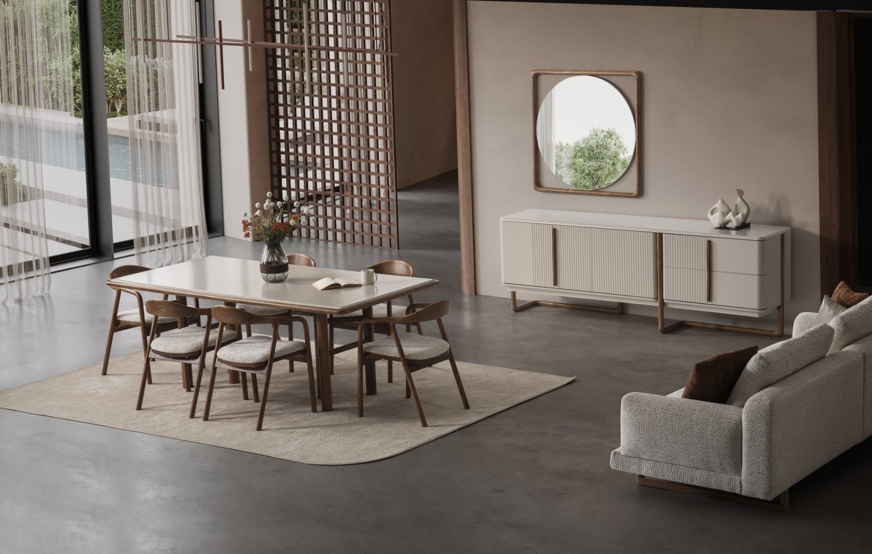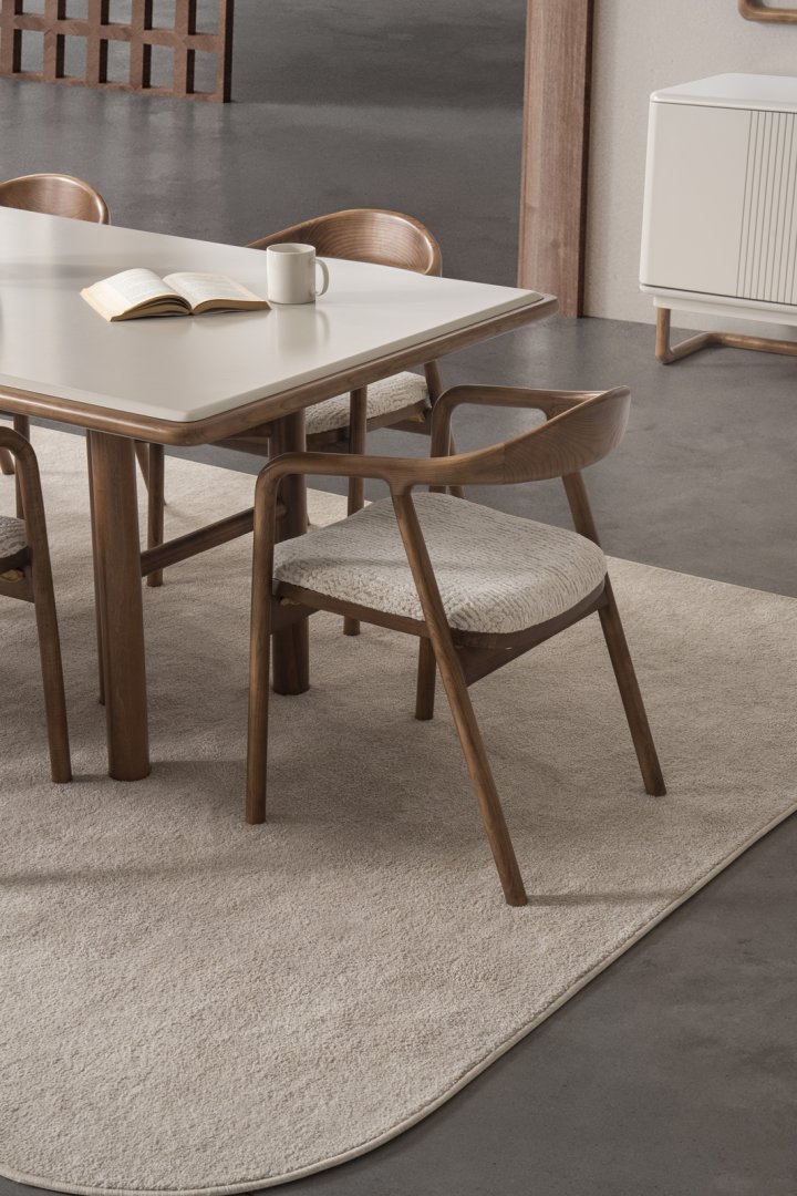 Masa, konsol ve tamamlayıcı elemanlar; uyumlu oranlarla tasarlanarak alan içinde akıcı bir yerleşim sağlar. Form dili, görsel karmaşadan uzak durarak yemek alanının sakin ve düzenli algılanmasına katkıda bulunur. Genel siluet, modern mekânlarda aranan sade, dengeli ve net görünümü yansıtır.