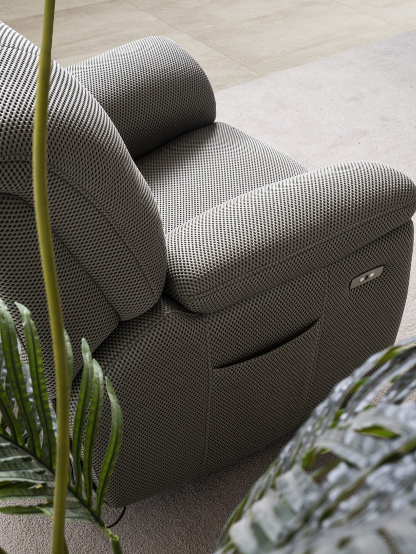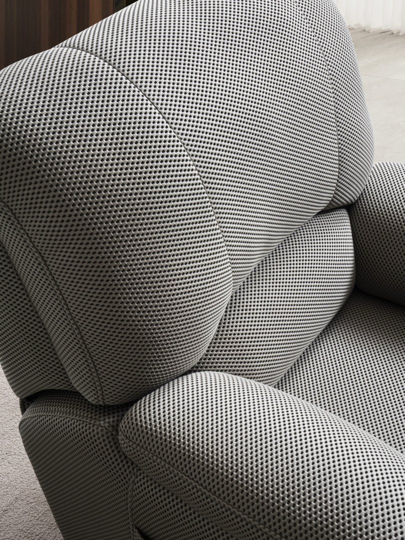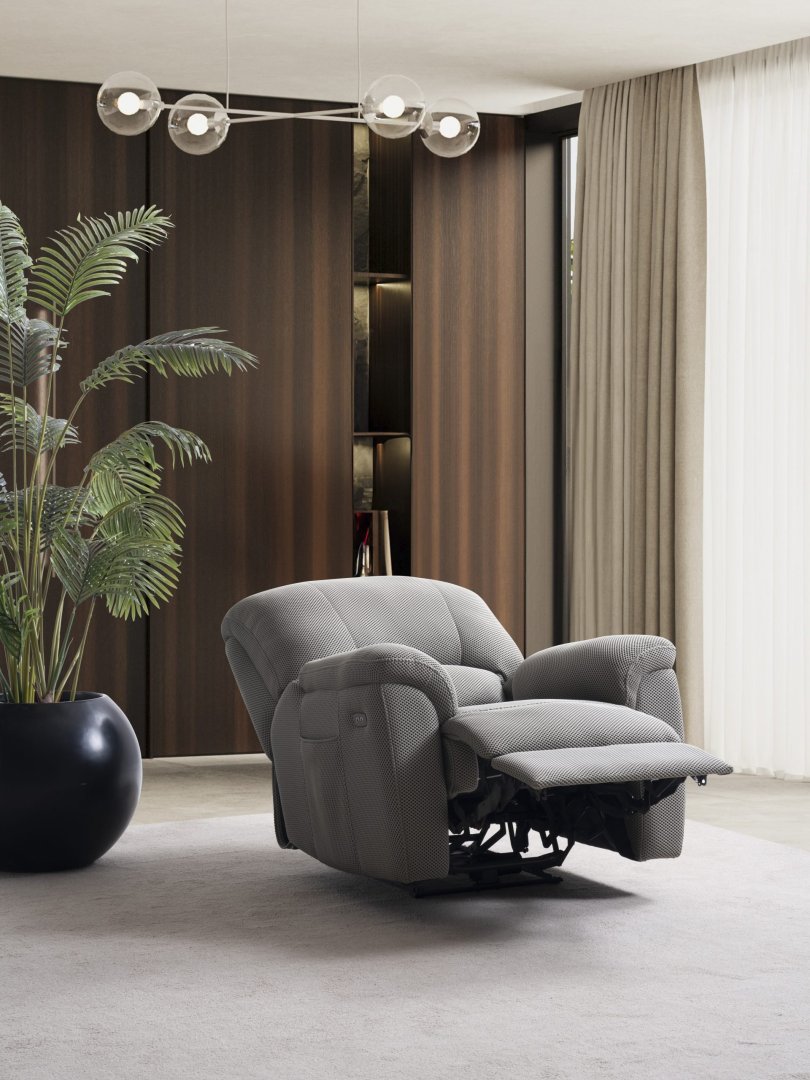 Oturum alanı, uzun süreli izleme deneyimini destekleyen ergonomik oranlarla tasarlanmıştır. Sırt yapısı vücudu doğal bir pozisyonda desteklerken, genel form mekânı baskılamadan konfor sunar. Siluet, modern mekânlarda aranan sade ve kontrollü görünümü korur.