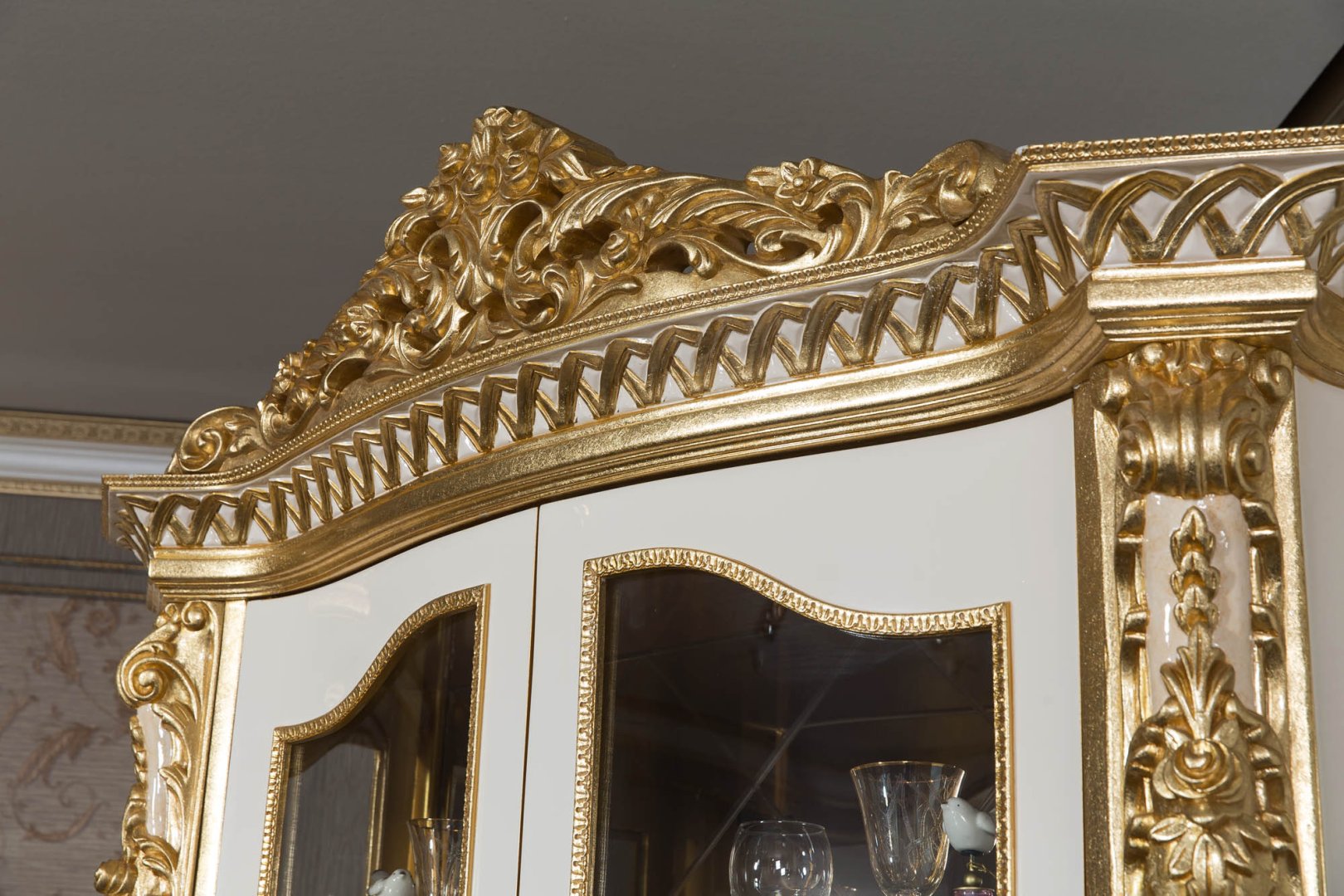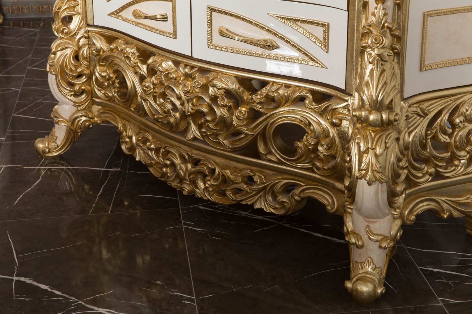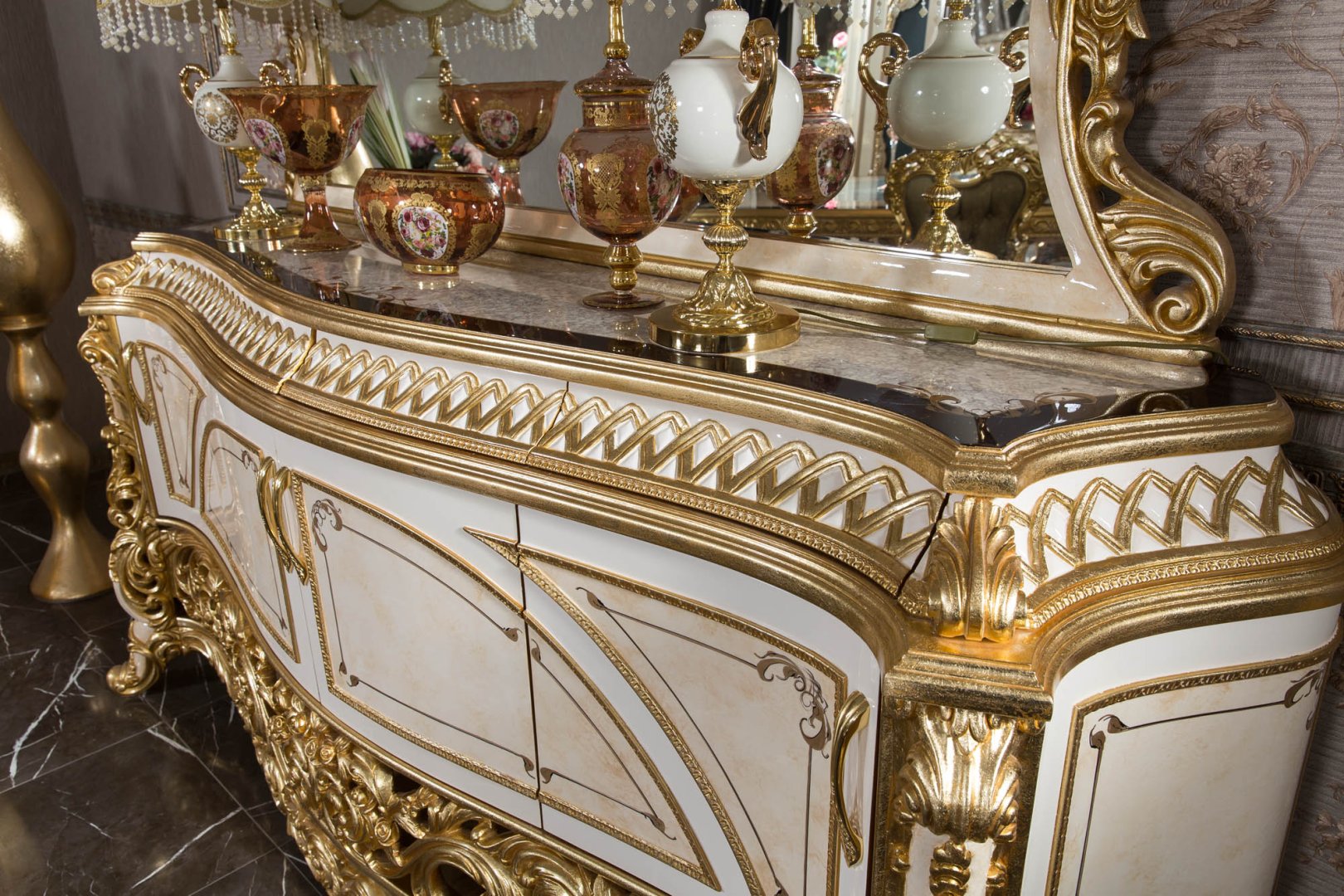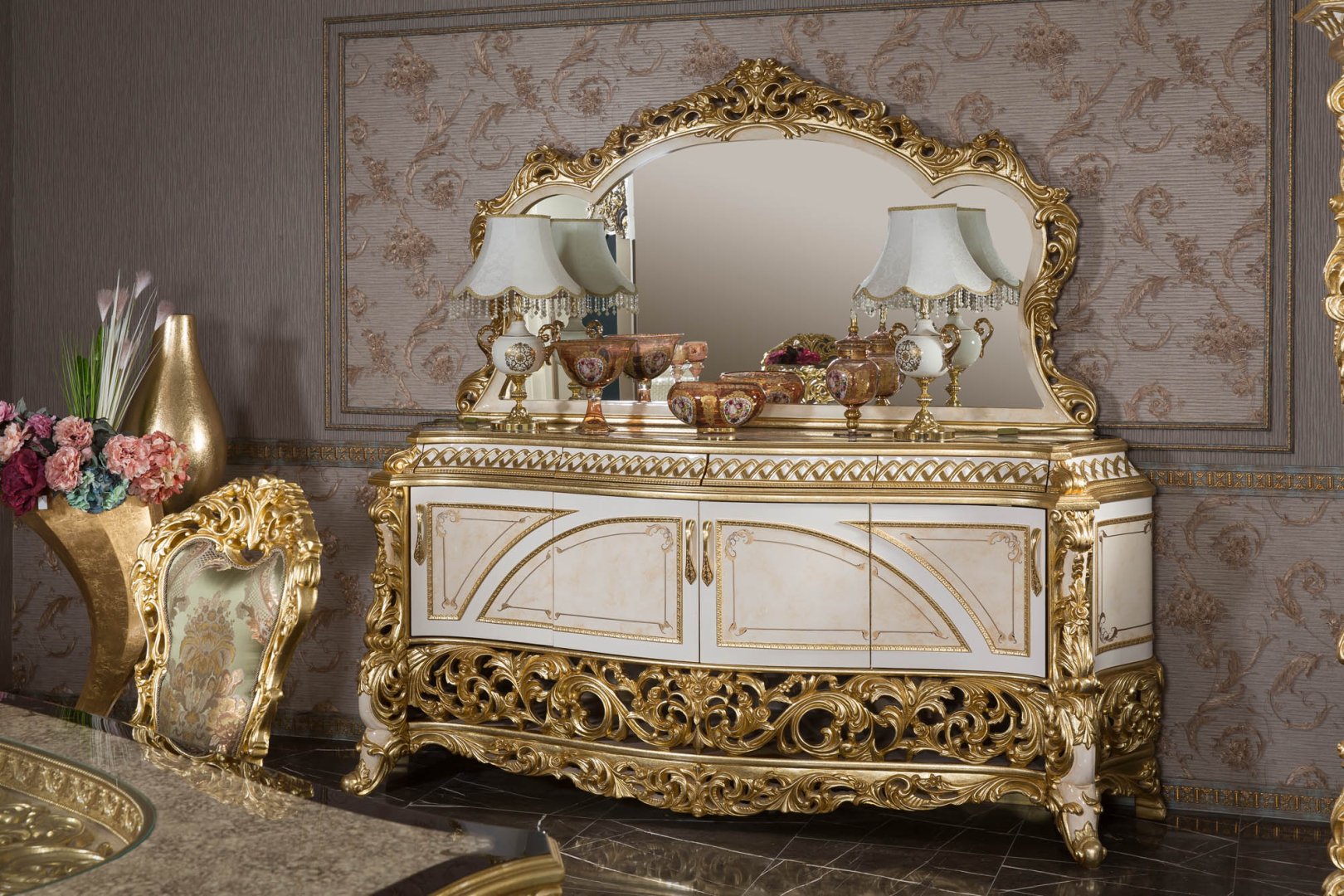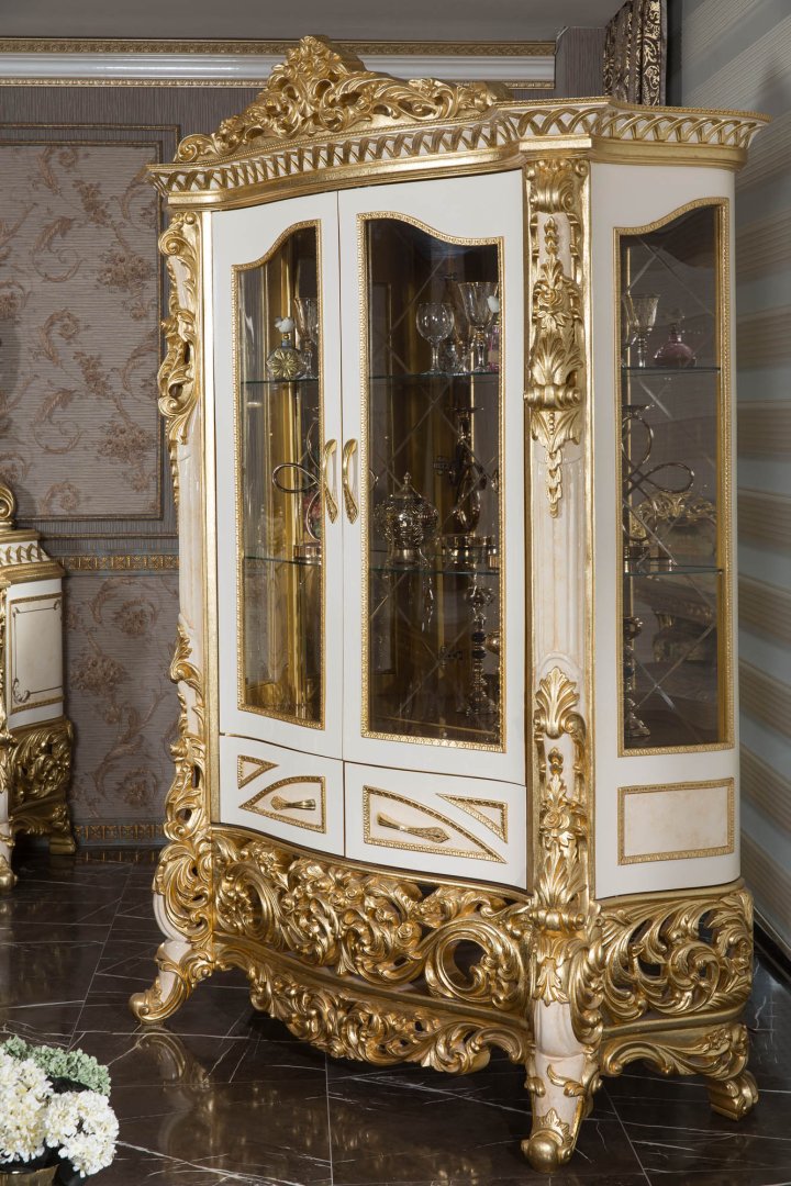 Asya Klasik Yemek Odası, klasik mobilya geleneğini zengin işçilik ve rafine detaylarla buluşturan, güçlü bir estetik kimliğe sahip seçkin bir tasarımdır. Altın tonlarının sıcak krem yüzeylerle dengelendiği bu kompozisyon, mekâna ihtişamlı fakat kontrollü bir zarafet kazandırır. Oymalı detaylar, dekoratif bir unsur olmanın ötesinde, ürünün karakterini tanımlayan mimari bir dil olarak ele alınmıştır.