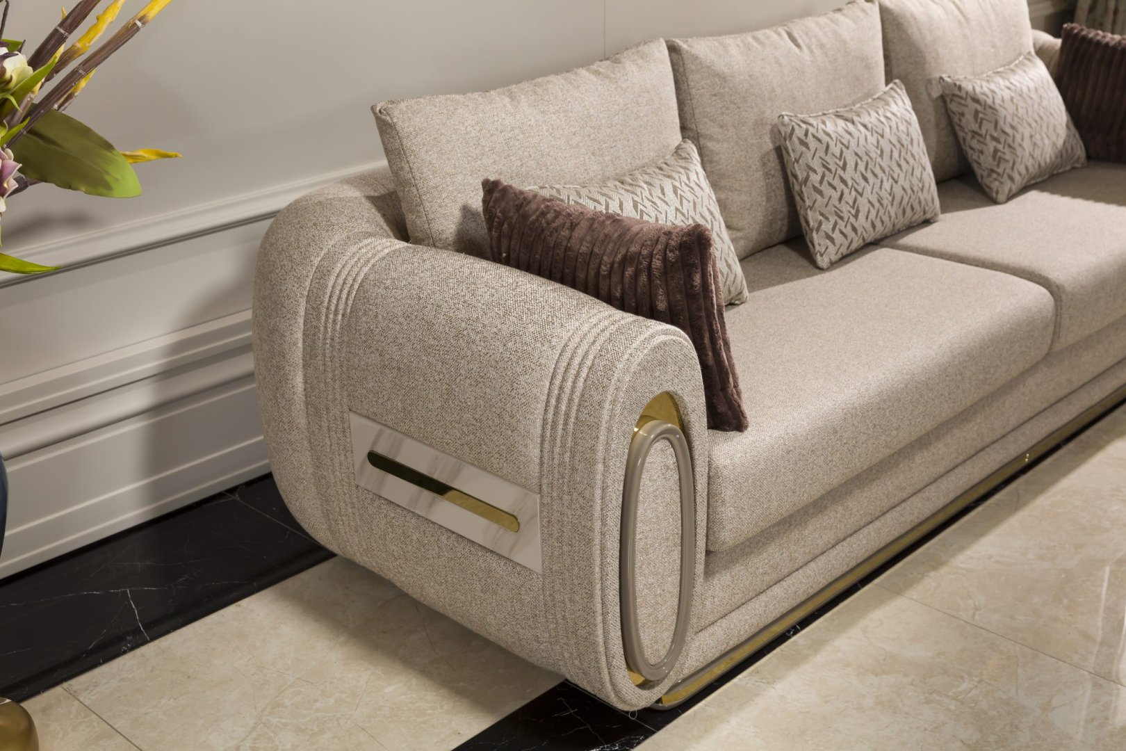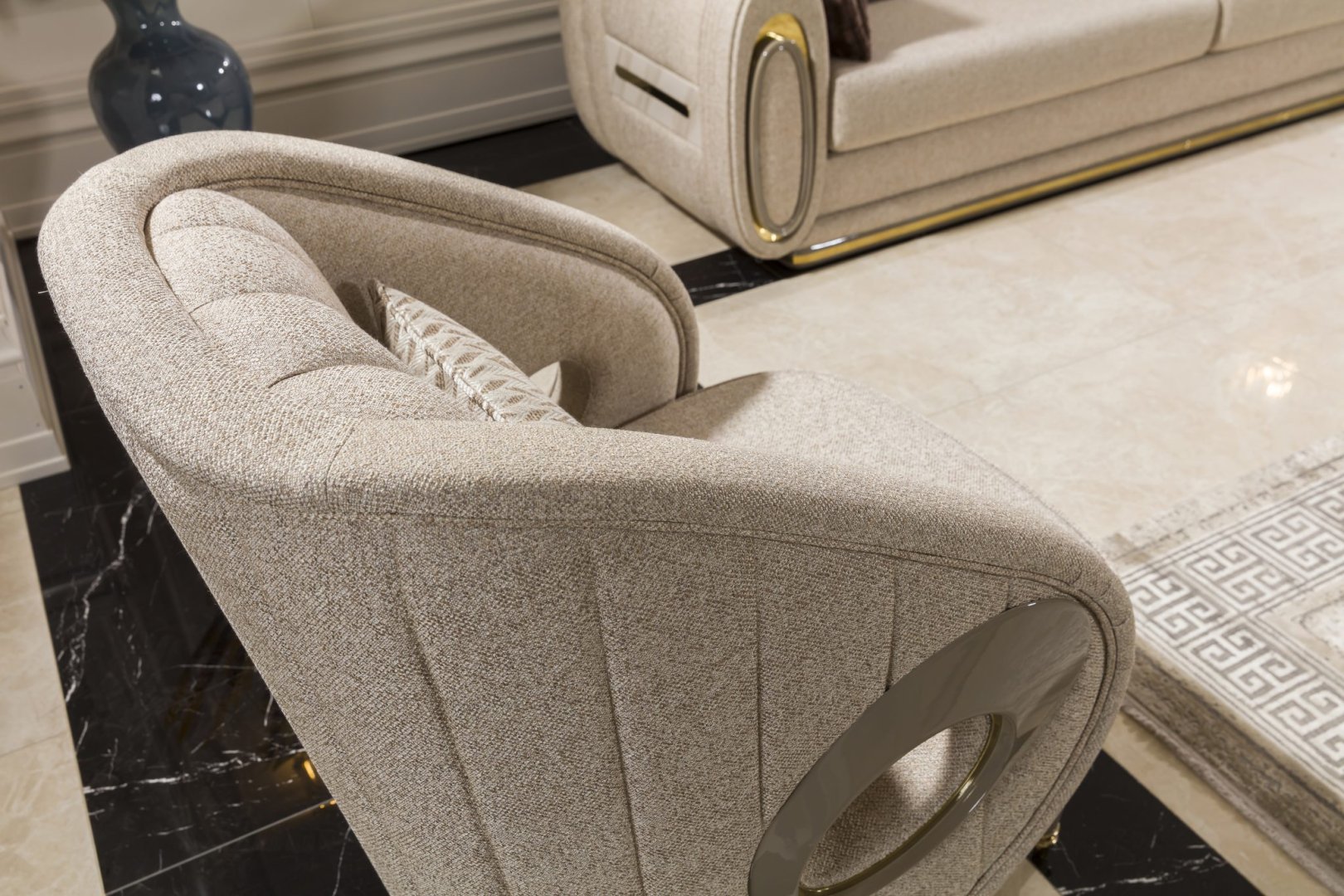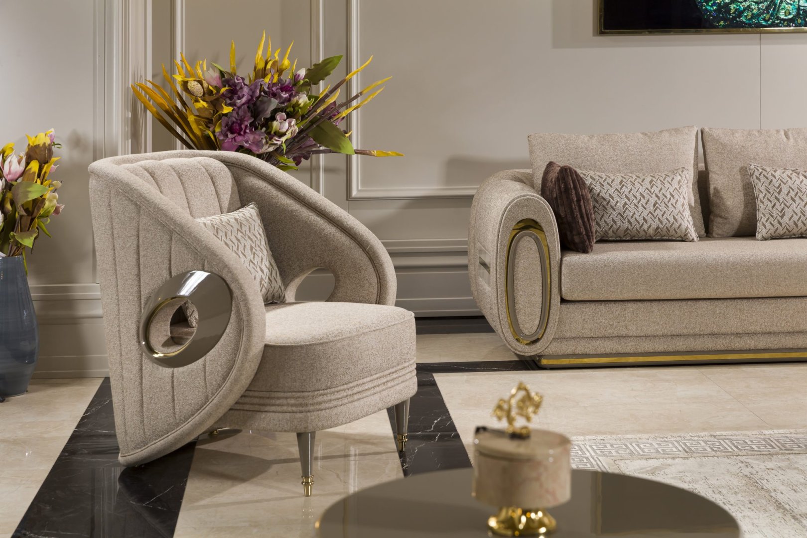 Belinay Luxury Koltuk Takımı, yumuşak hatları, dengeli oranları ve sade lüks anlayışıyla modern salon dekorasyonunda zarif bir bütünlük sunar. Açık renk paleti ve akıcı form yapısı sayesinde mekânda ferah, sakin ve sofistike bir atmosfer oluşturur.