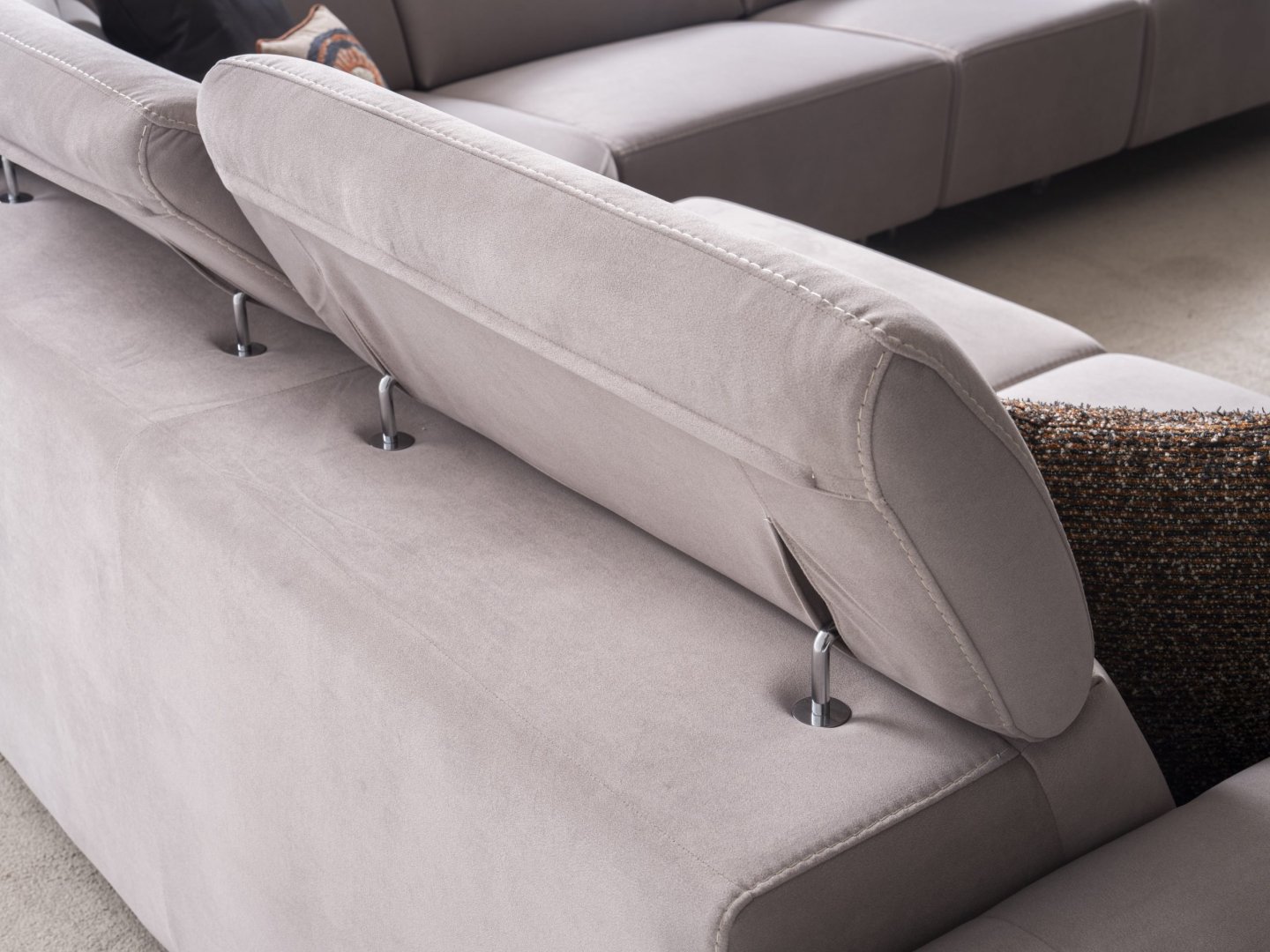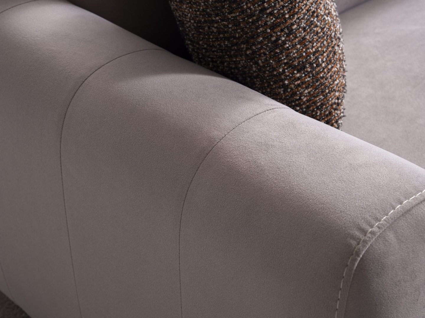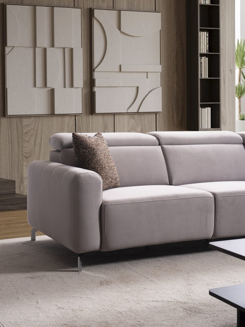 Oturum alanı, geniş yüzeyler ve dengeli oranlarla kurgulanmıştır. Sırt ve kol yapıları, hacimli formu dengeleyerek görsel bütünlüğü korur. Köşe geçişi, formun ağırlığını kesintiye uğratmadan süreklilik sağlayacak şekilde tasarlanmıştır. Genel siluet, modern mekânlarda aranan güçlü ama düzenli görünümü destekler.