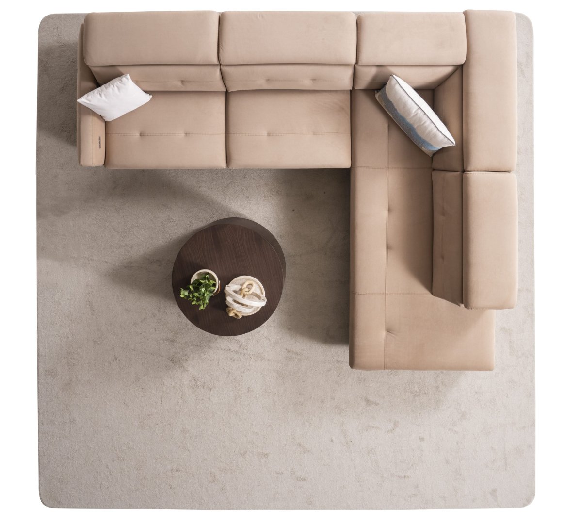 Gizem Köşe Koltuk, modern salon dekorasyonu içinde mekânın atmosferini zenginleştiren bir merkez oluşturur. Açık plan alanlarda derinlik hissini artırır, daha kompakt salonlarda ise alanı olduğundan daha katmanlı ve etkileyici gösterir. Derinlik odaklı form diliyle modern köşe koltuk anlayışına zamansız ve özgün bir yorum getirir.