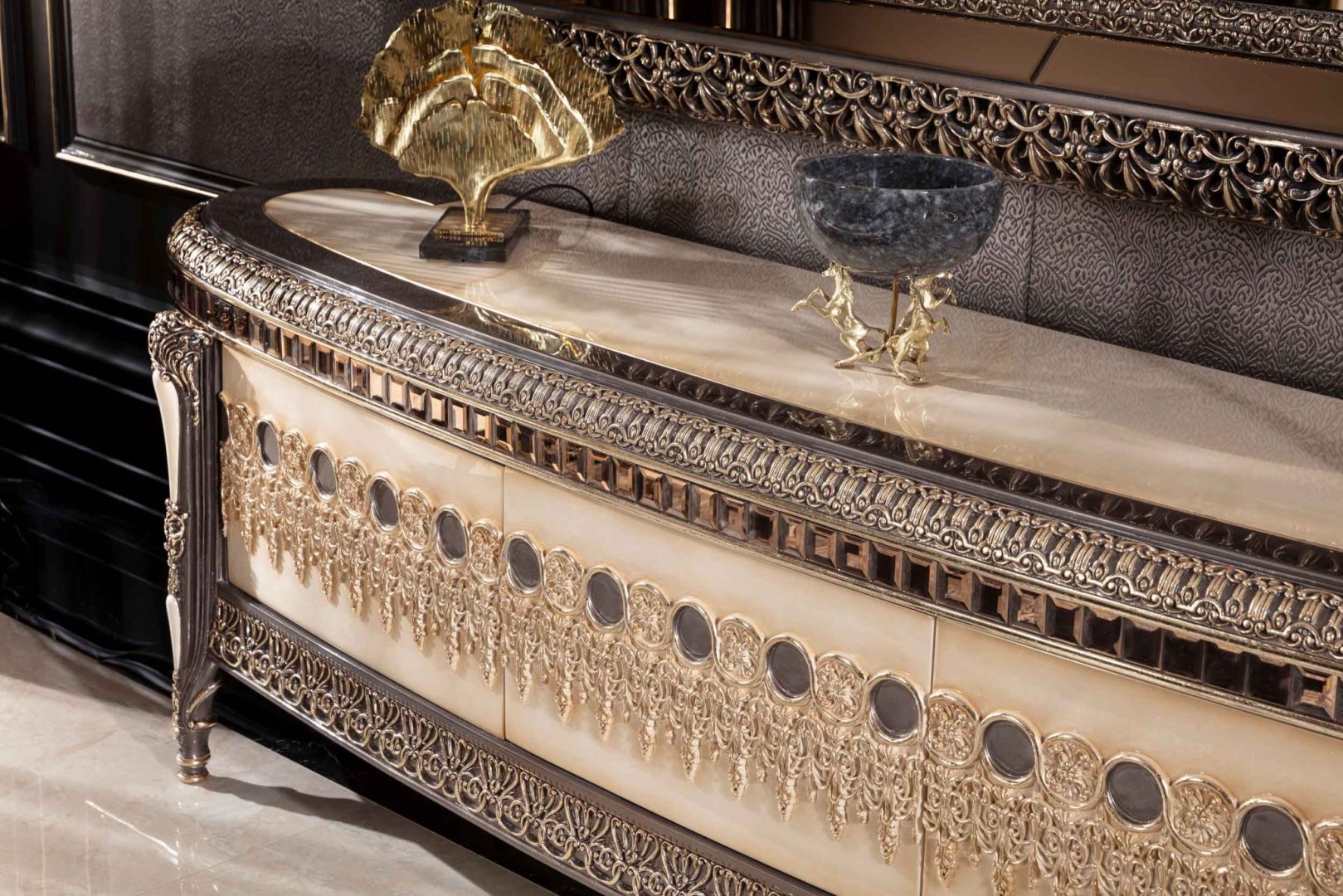 Gloria Luxury TV Ünitesi, klasik lüks anlayışını zarif detaylar, dengeli oranlar ve güçlü bir salon duruşu ile yorumlayan prestijli bir tasarımdır. Çerçeveli yapısı ve ağır form diliyle yaşam alanında otorite ve şıklık hissi oluşturur. Gloria, klasik ve gösterişli salonlar için tasarlanmış, dikkat çeken ve mekâna değer katan bir TV ünitesidir.