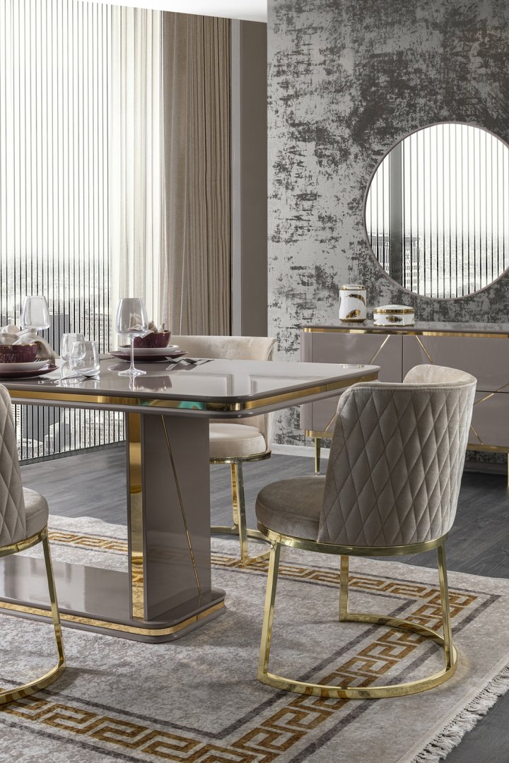 Gucci Yemek Odası, modern yaşam alanlarında zarafet ve dengeyi merkeze alan sofistike bir yemek alanı kurgusu sunar. İncelikli form dili ve özenle kurgulanmış oranlar, mekânda şık ve düzenli bir atmosfer oluşturur. Bu yaklaşım, Gucci’yi modern yemek odası takımları arasında daha seçkin ve rafine bir noktaya taşır.