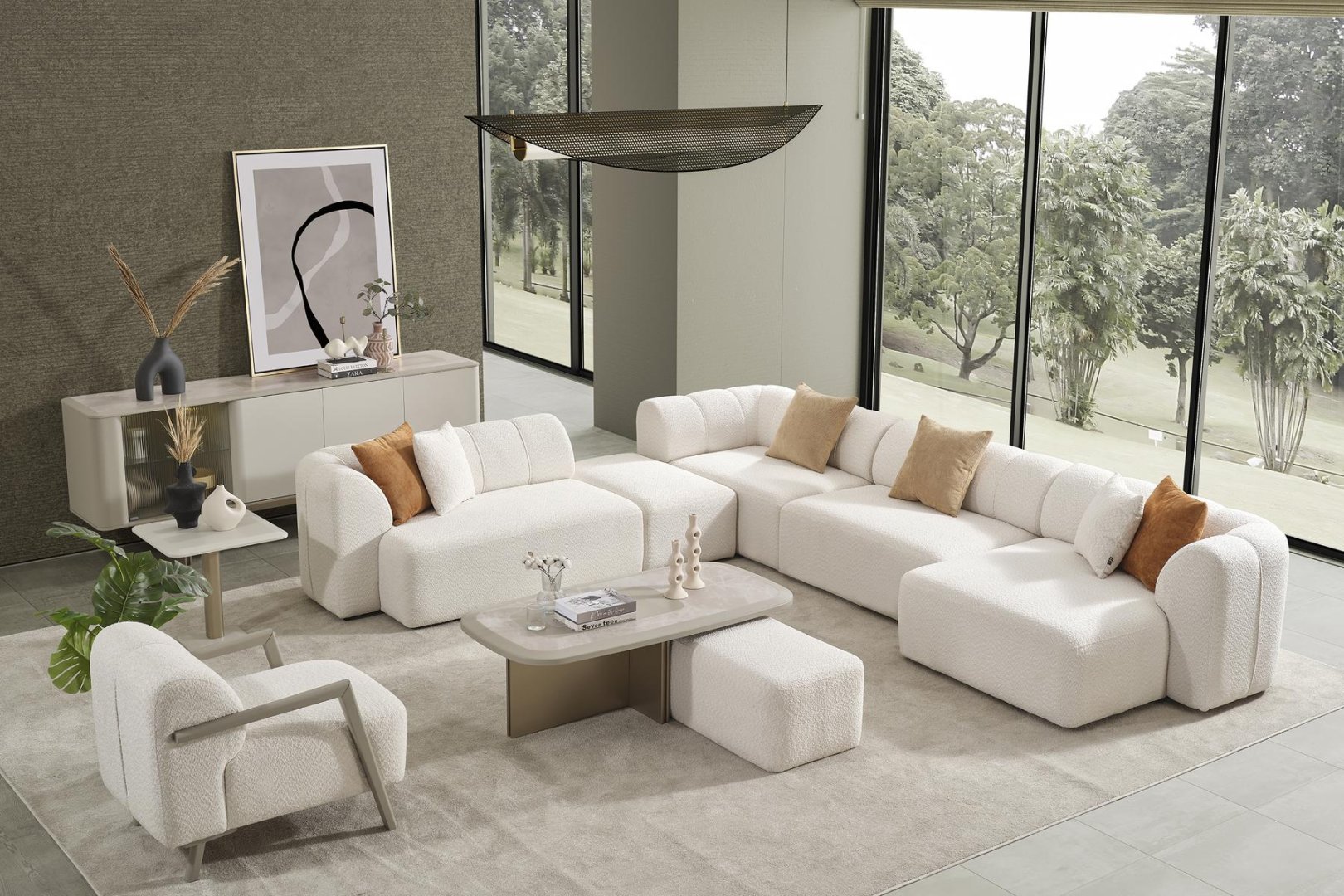 Harley Köşe Takımı, modern salon dekorasyonu içinde mekânın merkezini belirleyen kuvvetli bir odak oluşturur. Geniş yaşam alanlarında etkileyici bir yerleşim sunar, sade salonlarda ise ortama karakter kazandırır. Güçlü form diliyle modern köşe koltuk anlayışına zamansız ve kararlı bir yorum getirir.