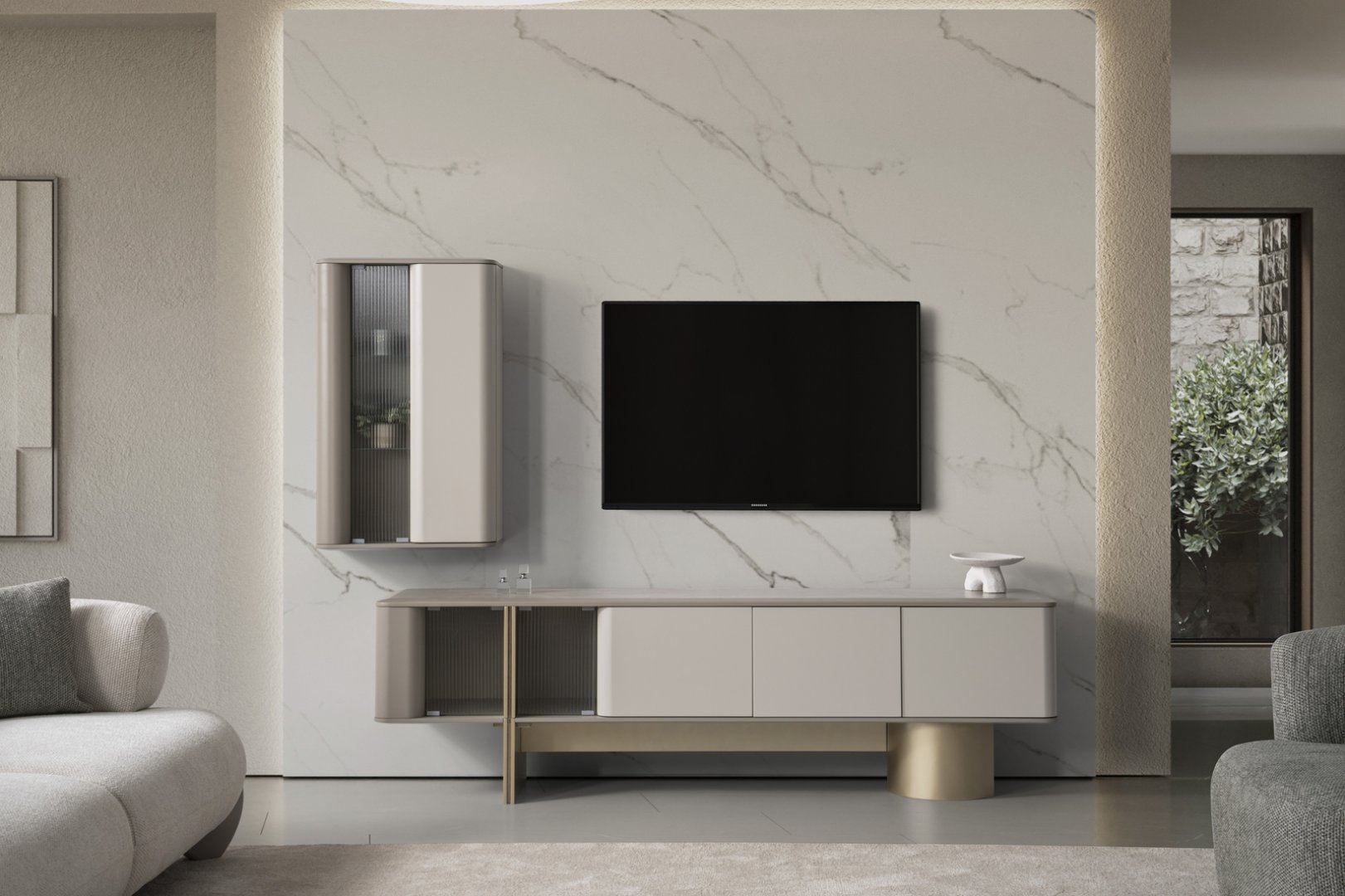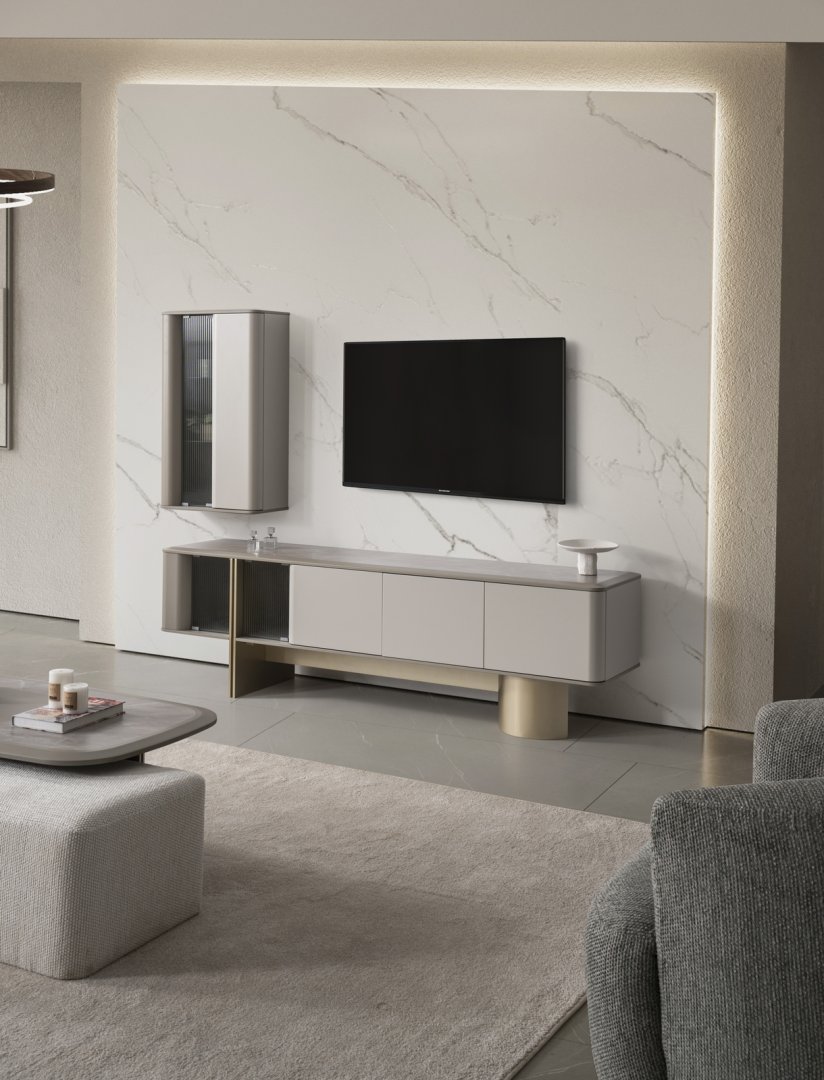 Harley Modern TV Ünitesi, modern salon dekorasyonu içinde TV alanını belirgin bir odak noktası hâline getirir. Açık plan yaşam alanlarında mimari düzeni destekler, daha kompakt salonlarda ise mekâna karakter ve derinlik kazandırır. Güçlü form diliyle modern TV ünitesi anlayışına zamansız ve kararlı bir yorum sunar.