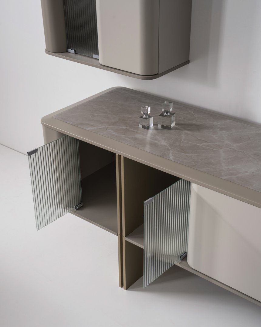 Ünite formu, duvar yüzeyiyle bütünleşen ölçüler üzerinden kurgulanmıştır. Yatay çizgilerin baskın kullanımı, mekânda genişlik ve düzen hissi yaratır. Yüzeyler arası net geçişler, görsel karmaşayı ortadan kaldırarak sade ama güçlü bir etki sağlar. Genel siluet, modern mekânlarda aranan net, düzenli ve oturaklı görünümü yansıtır.