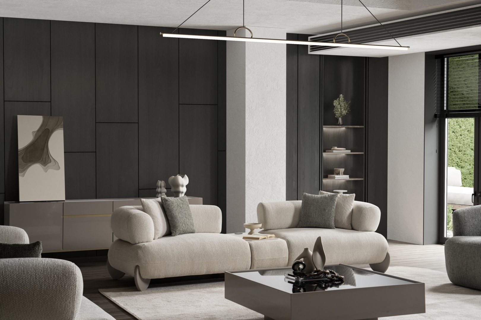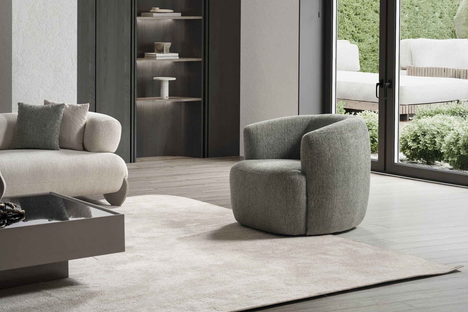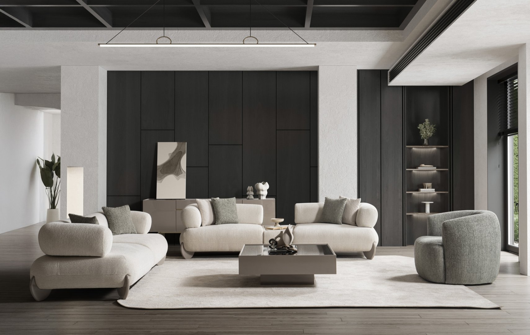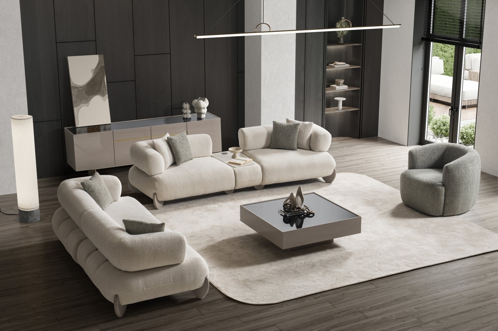 Moon Koltuk Takımı, modern yaşam alanlarında yumuşak geçişler ve dengeli hacimlerle sakin bir estetik sunan çağdaş bir salon yerleşimi oluşturur. Akıcı form dili, mekânda sert köşeleri yumuşatarak huzurlu ve dengeli bir atmosfer sağlar. Bu yaklaşım, Moon’u modern koltuk takımları arasında daha rafine ve akışkan bir noktaya taşır.