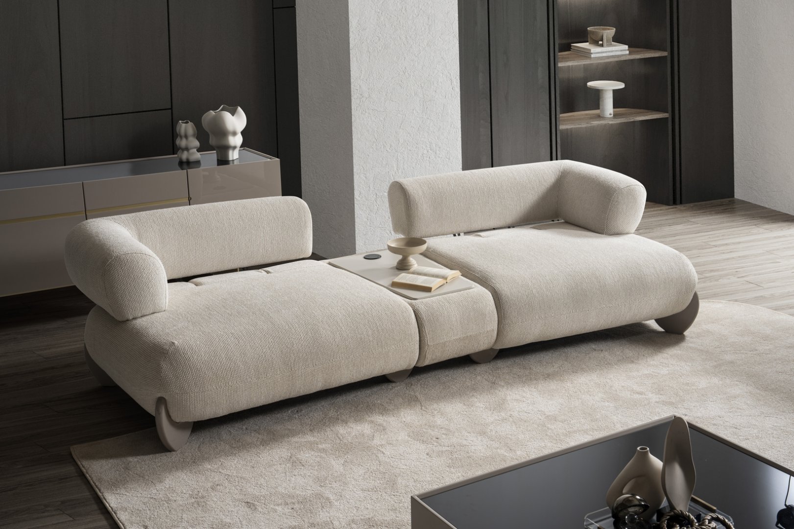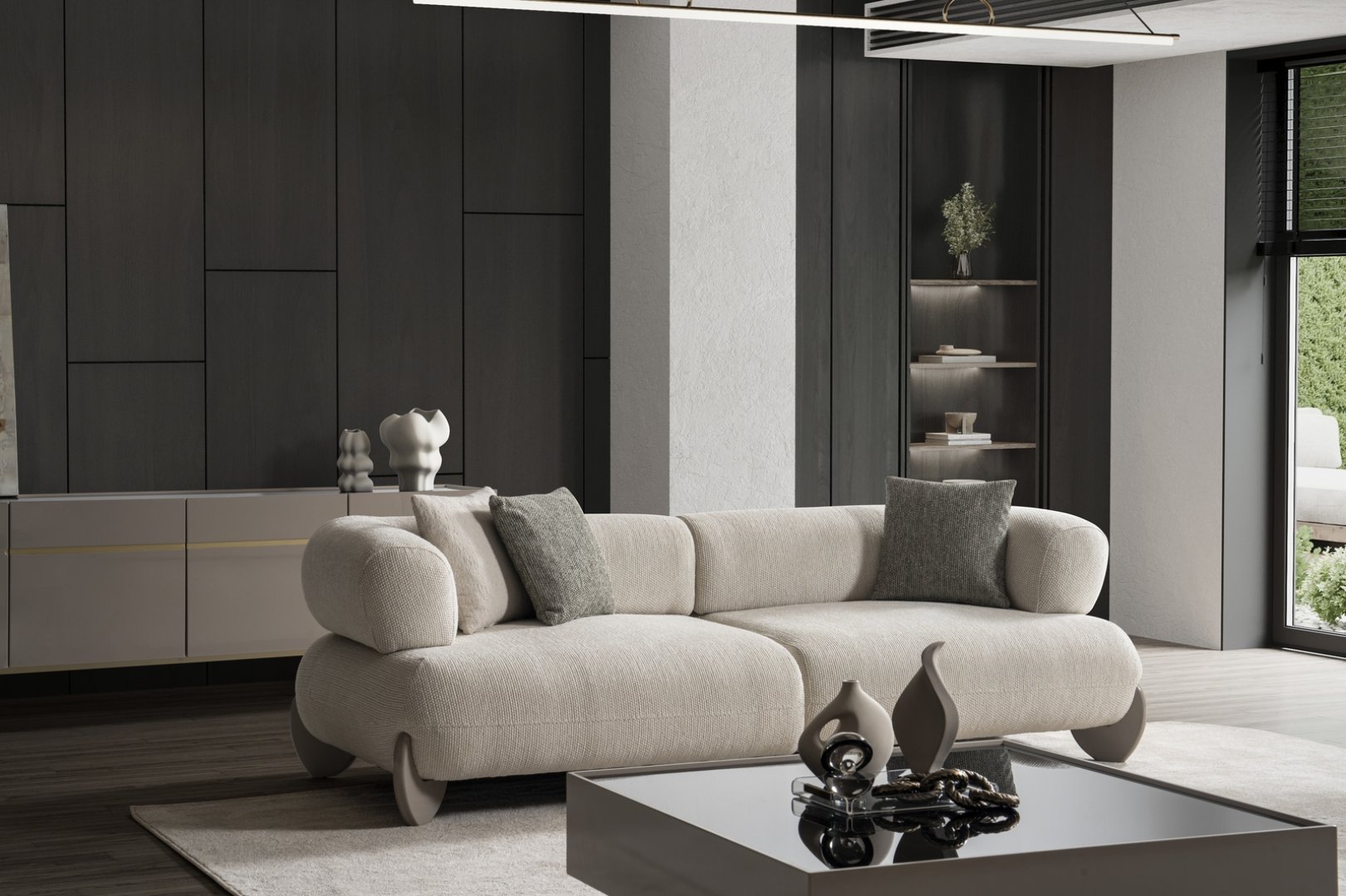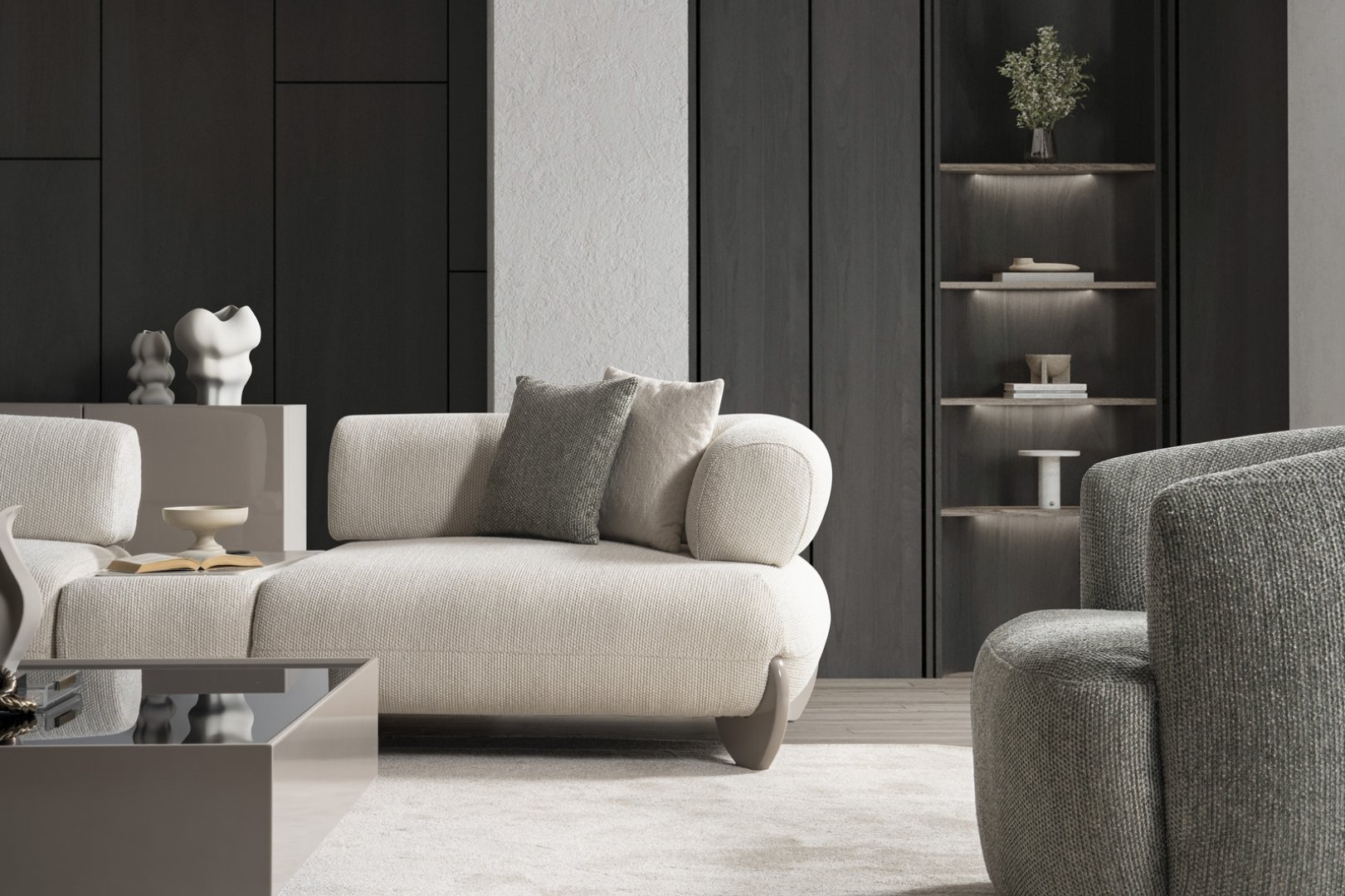 Moon Koltuk Takımı, modern salon dekorasyonu içinde mekâna sakin bir merkez kazandırır. Açık plan yaşam alanlarında akıcı bir yerleşim oluşturur, daha kompakt salonlarda ise alanın ferah ve düzenli algılanmasına katkıda bulunur. Yumuşak form diliyle modern koltuk takımı anlayışına zamansız bir yorum getirir.