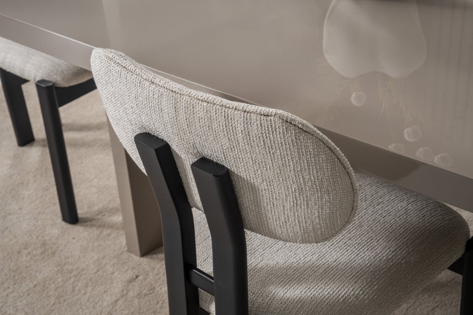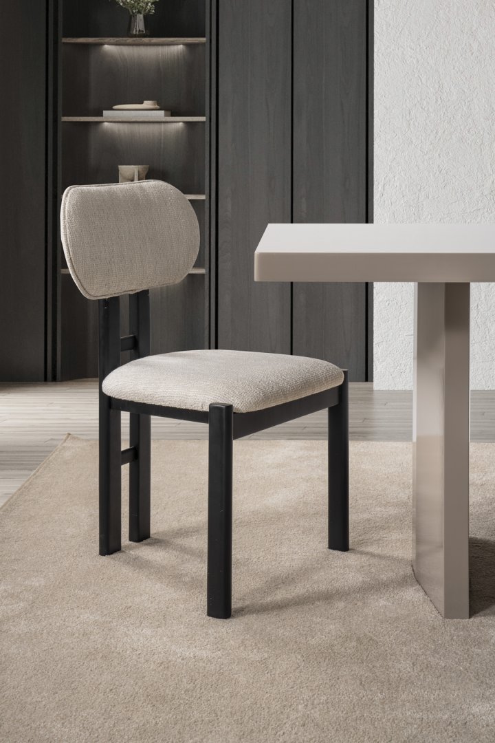 Masa ve tamamlayıcı üniteler, görsel bütünlüğü destekleyen ölçülü oranlarla tasarlanmıştır. Yüzeyler arasındaki akış, yemek alanında düzenli ve ferah bir kompozisyon sağlar. Genel siluet, modern mekânlarda aranan sade, yumuşak ve dengeli görünümü yansıtır.