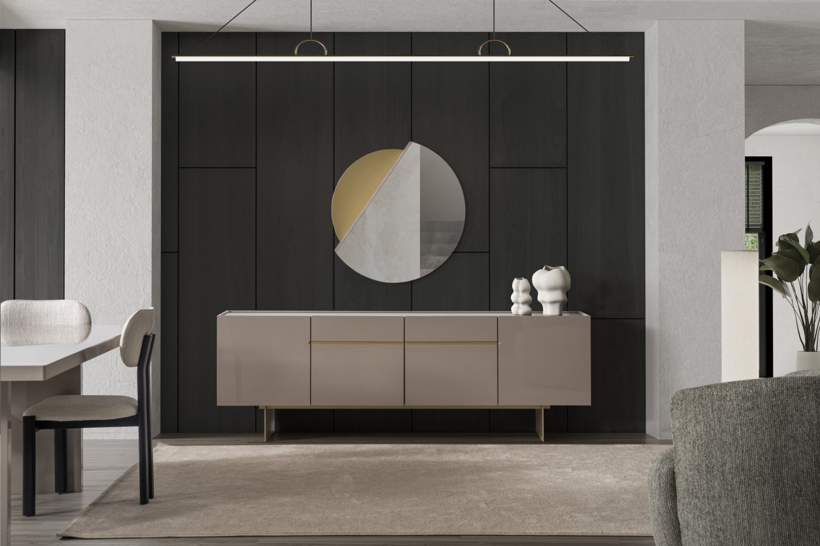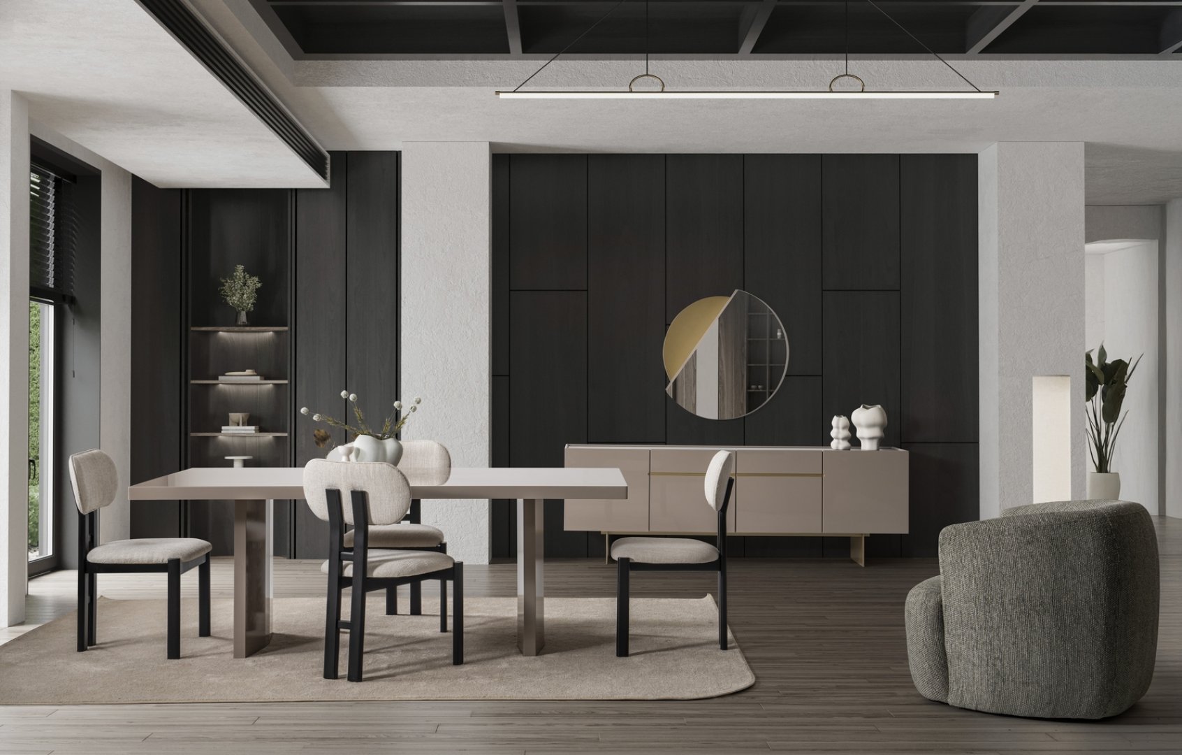 Moon Yemek Odası, modern iç mekân tasarımında yemek alanını sakin bir odak noktası hâline getirir. Açık plan yaşam alanlarında mekânsal sürekliliği destekler, daha kompakt alanlarda ise ferahlık ve düzen algısını güçlendirir. Yumuşak form diliyle modern yemek odası anlayışına zamansız bir yorum sunar.