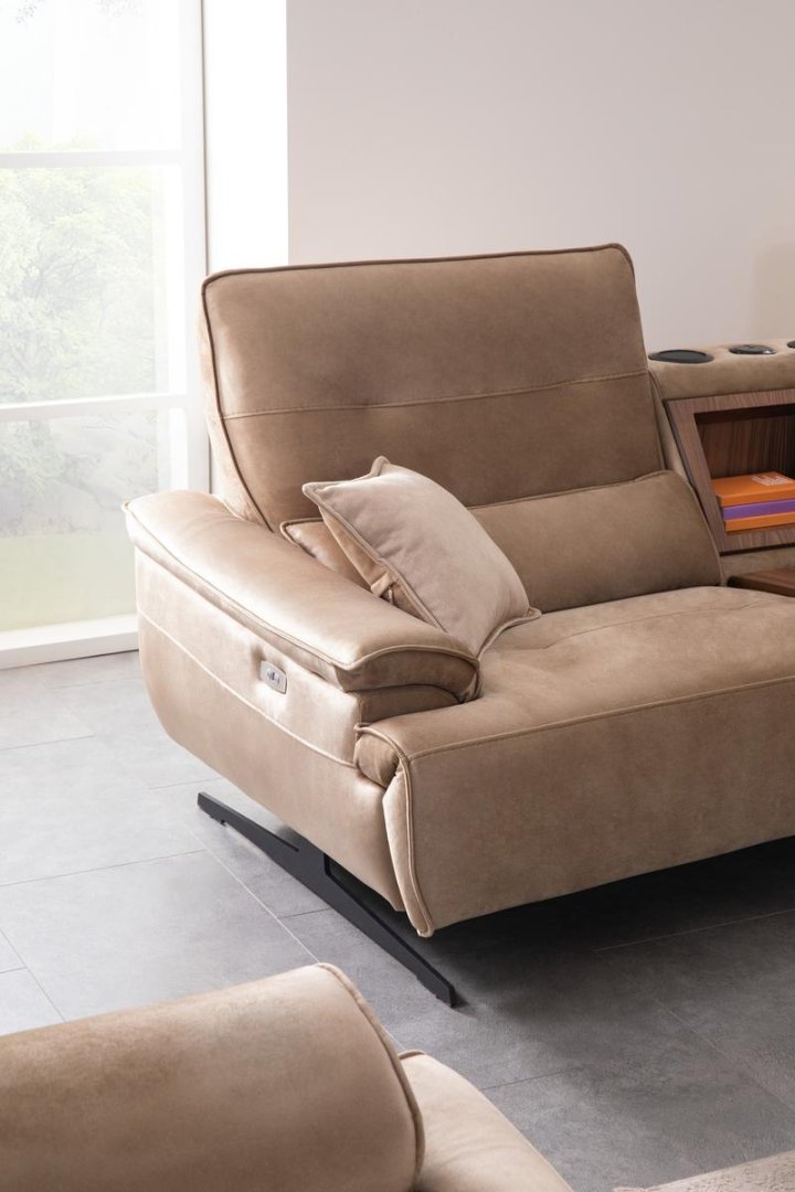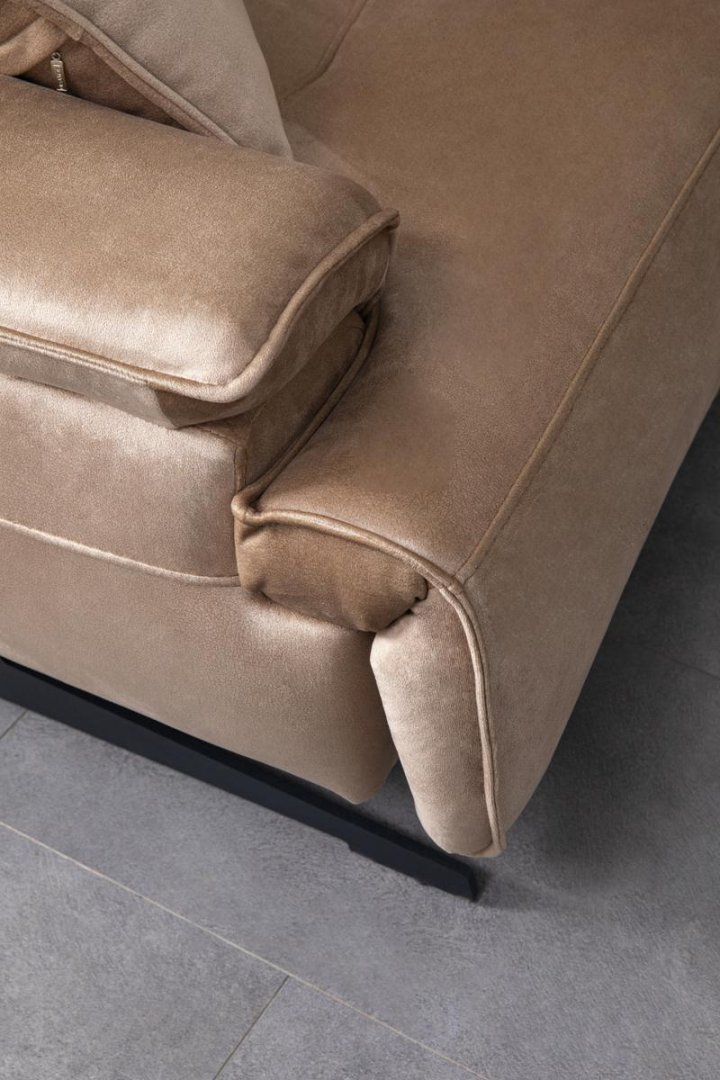 Oturum alanı yayvan ve akıcı bir yapı sergilerken, sırt oranları mekânla uyumlu bir yükseklikte tutulmuştur. Kol detayları tasarımın yatay etkisini güçlendirerek bütünsel bir görünüm oluşturur. Genel form dili, modern salonlarda aranan yalınlık ve düzen hissini destekler.