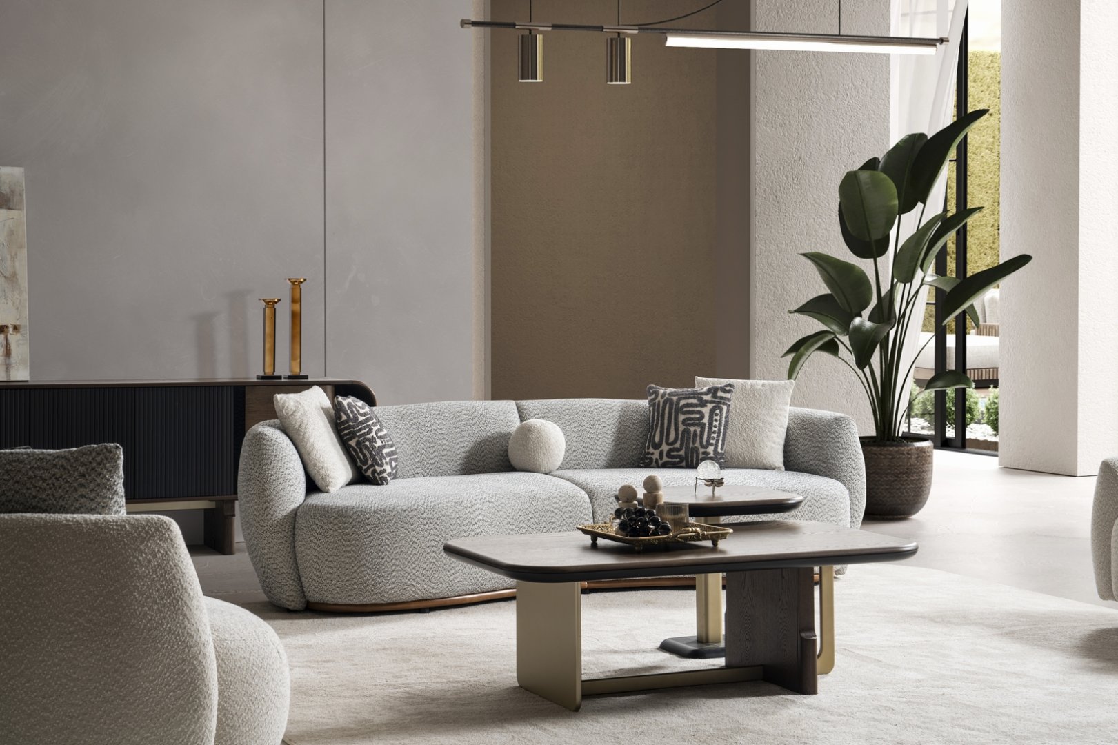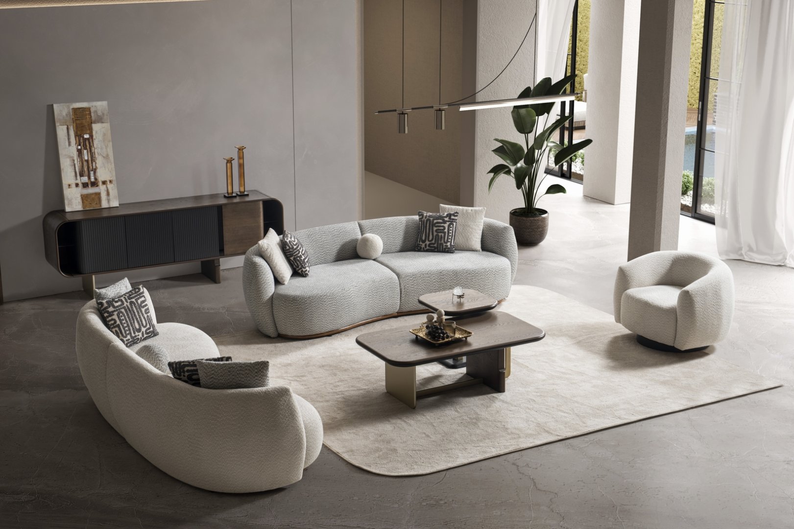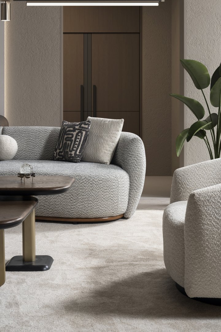 Senfoni Koltuk Takımı, modern salon dekorasyonu içinde mekânın farklı elemanlarını bir araya getiren bir merkez oluşturur. Açık plan yaşam alanlarında akıcı bir yerleşim sağlar, daha kompakt salonlarda ise düzenli ve ferah bir algı yaratır. Uyum odaklı form diliyle modern koltuk takımı anlayışına zamansız bir yorum getirir.