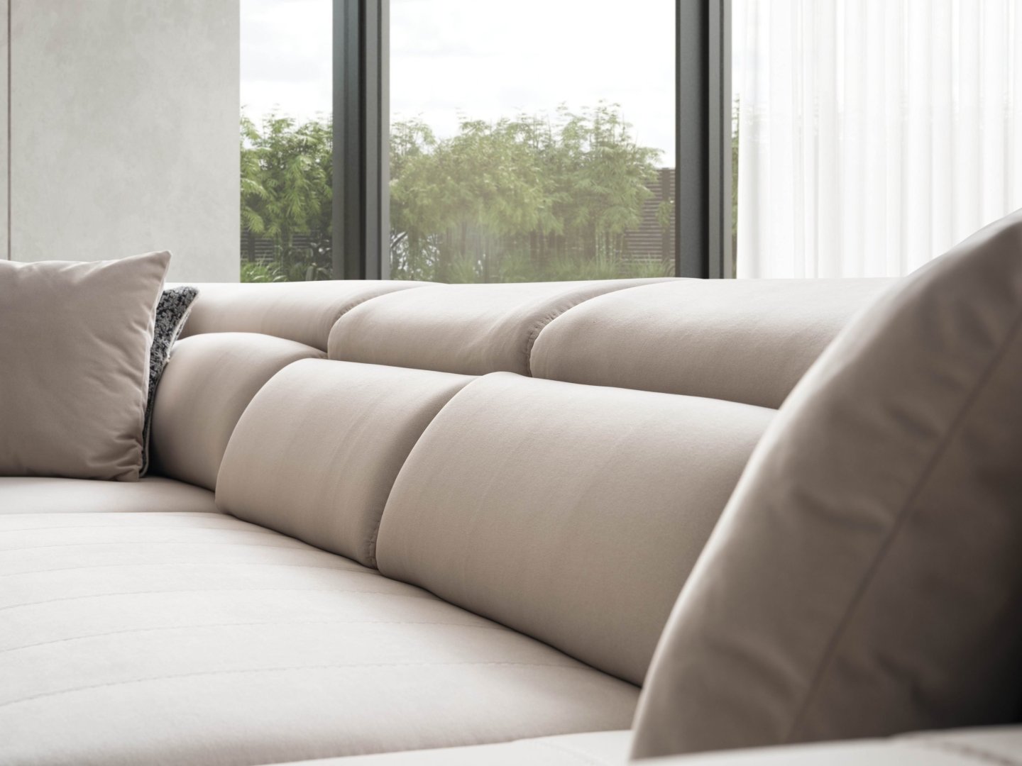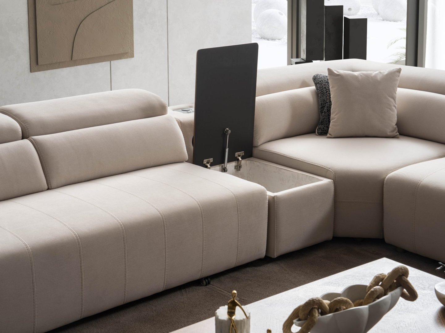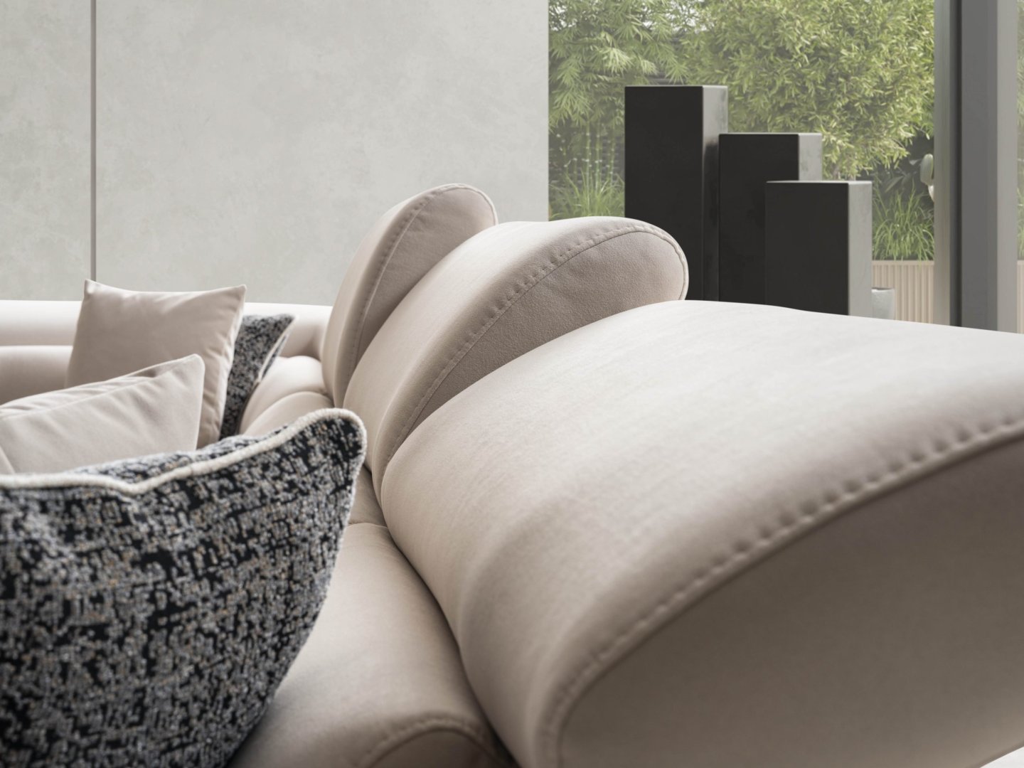 Oturum alanı, uzun süreli kullanımı destekleyen dengeli derinlik ve genişlik oranlarıyla tasarlanmıştır. Sırt yapısı hacimli formu dengeleyerek mekânla uyumlu bir bütünlük sağlar. Köşe geçişi, formun bütünlüğünü bozmadan süreklilik hissi verecek şekilde ele alınmıştır. Genel siluet, modern mekânlarda aranan sağlam ama sade görünümü korur.